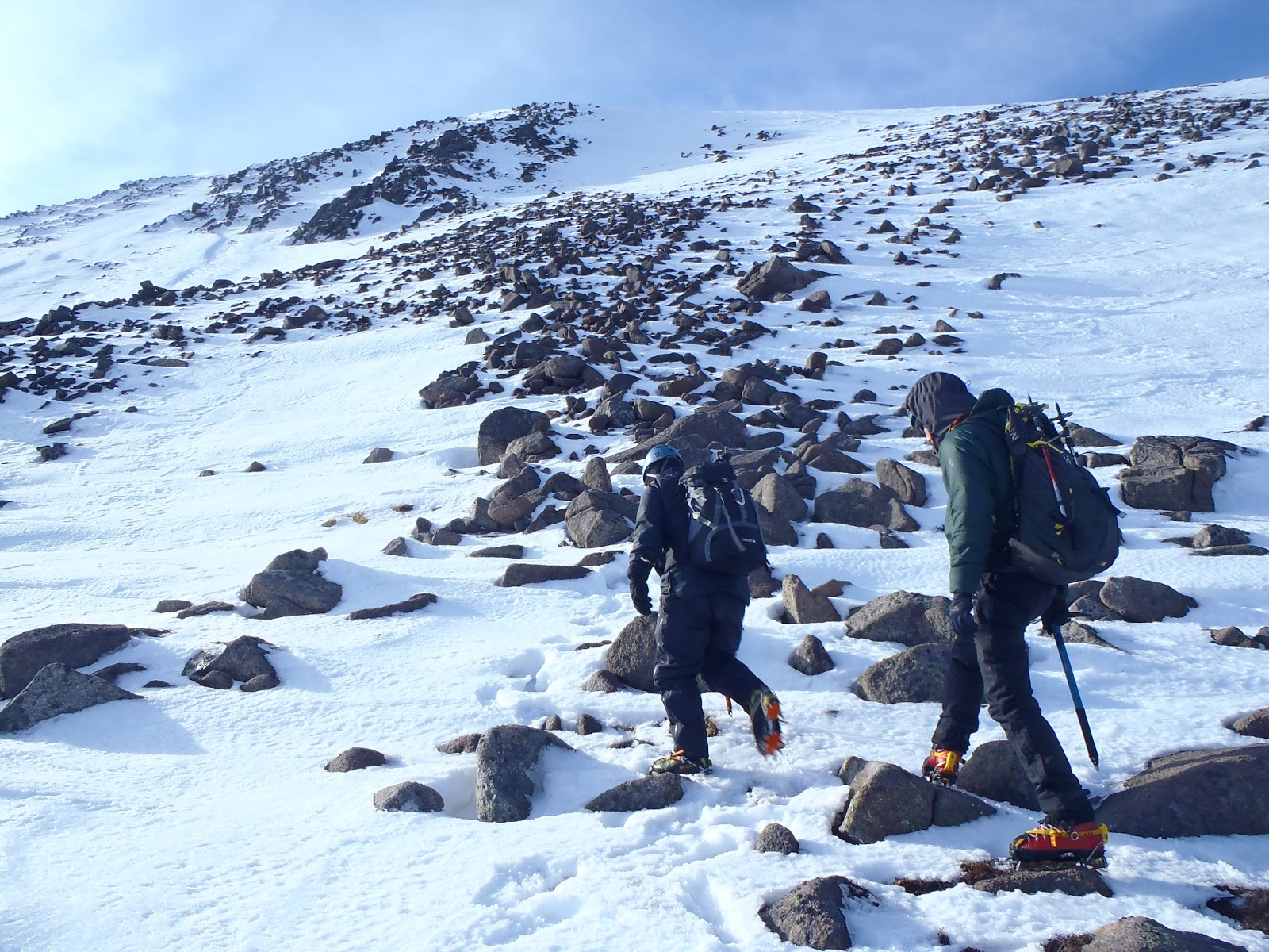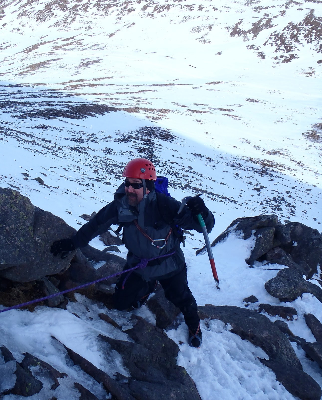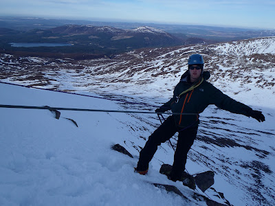 On the second day of the course Al, George, Guy and Gavin wanted some movement coaching on grade I/II scrambling and a look at some basic ropework, so we headed off to the Twin Ribs for a short climb with a lot of variety to look at. The top Cairngorm Ski Resort Car Park was full by 9am (there were cars streaming up there at 8am). When I was walking in to the coire later at 9.30am the ski slopes were already crouded with hundreds of people. There were other hundreds moving into the northern corries. It was an incredibly busy day, but we had the Twin Ribs to ourselves all day :)