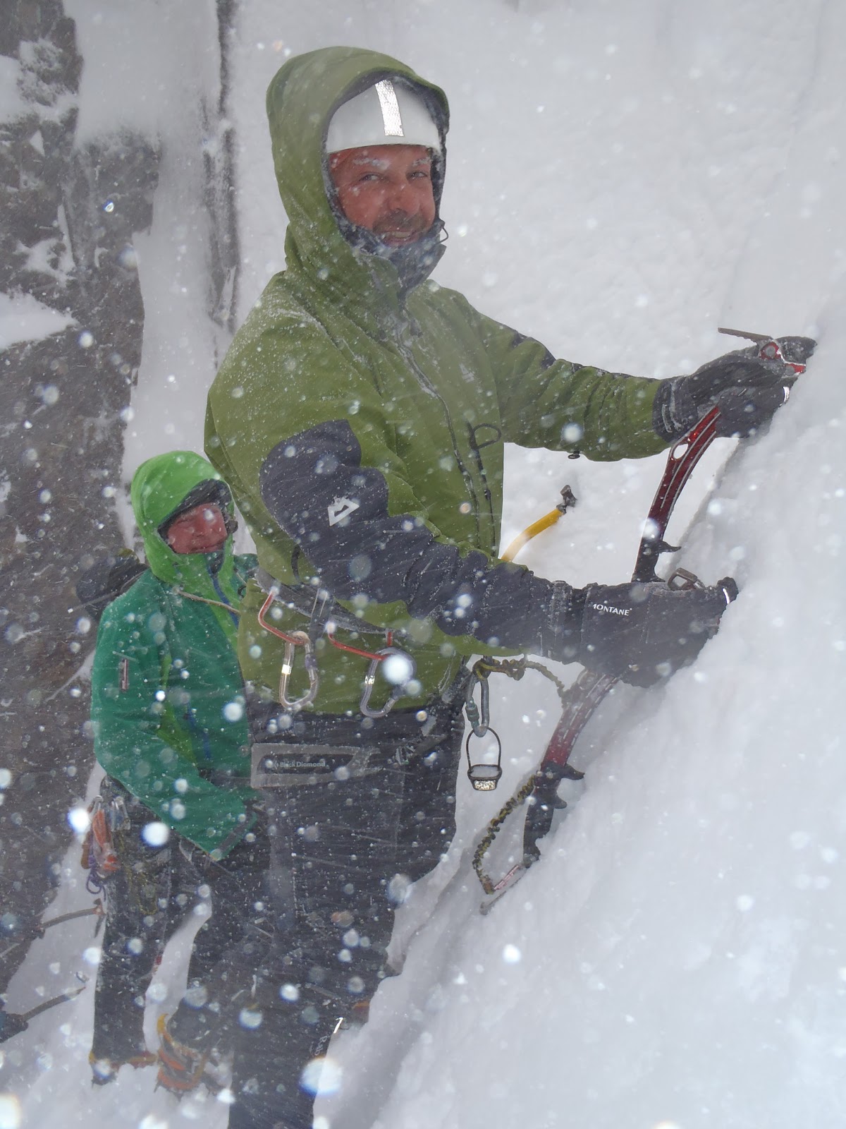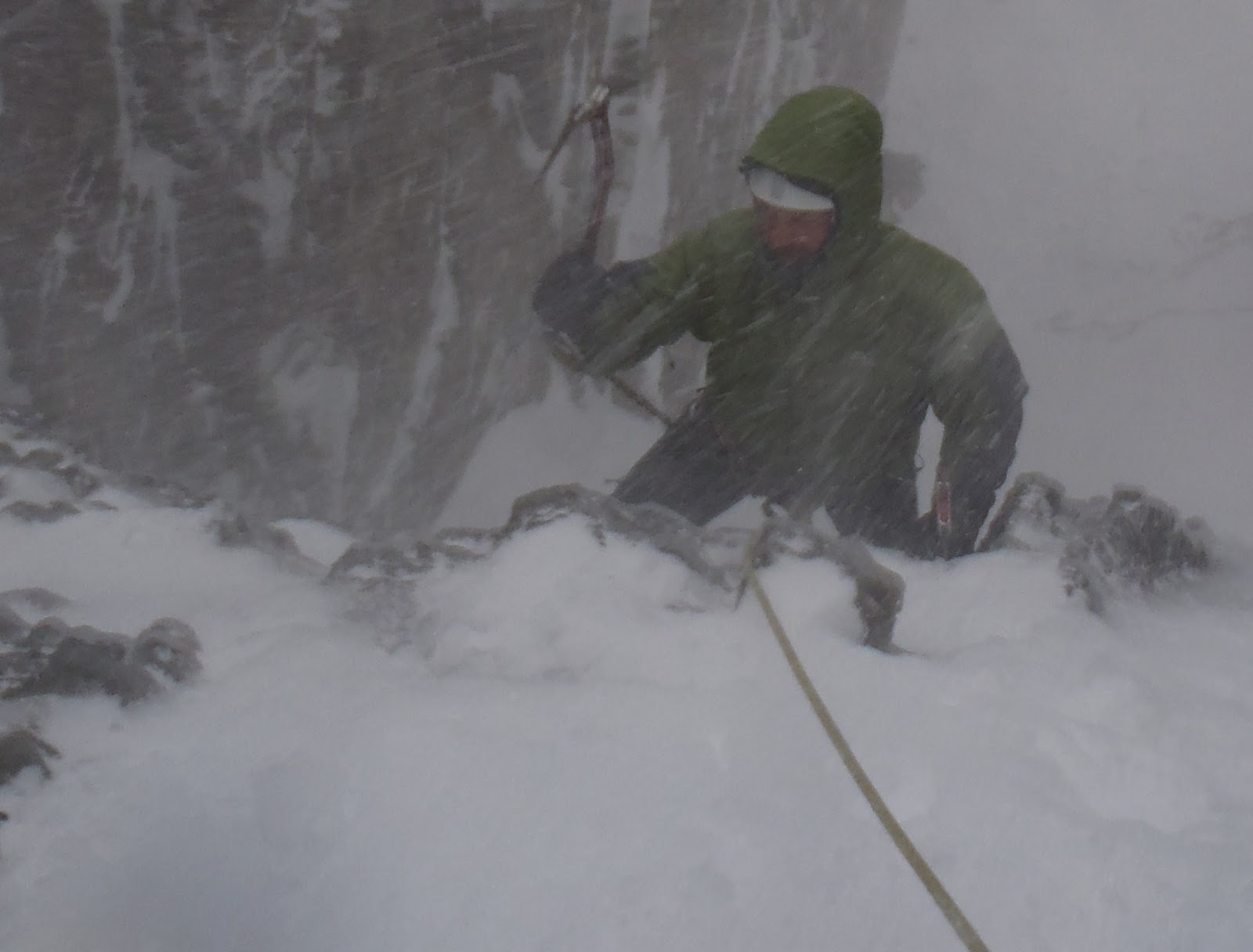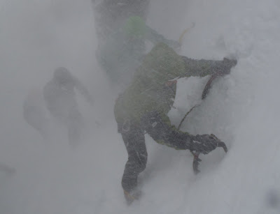 Today the 5 day climbing course started to a very poor weather forecast - wind, wind, wind. The strongest I've worked in this season. After briefing the group we headed off to the Ben to find out how the low level ice was looking. After a much bigger battle than normal we did manage to get to the CIC gulch ice. On the way up there was often white out conditions, but luckily the feet seemed to know the way. We managed to find a spot of shelter from the storm and had a cup of tea - very British. The Gulch turned out to be a great spot for bouldering, a couple of excellent short mixed climbs and a few steeper ice lines. I even managed a 2 pitch line to look at belay construction and an abseil retreat - sometimes without being able to see who was standing next to me! Well done Jim and John for being such keen winter climbers, and enjoying the suffering.