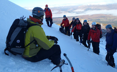 The weather was fantastic. We went through a great deal of basic winter skills and introductory ropework with the groups followed up with an introduction to winter mountain hazards in the evening.