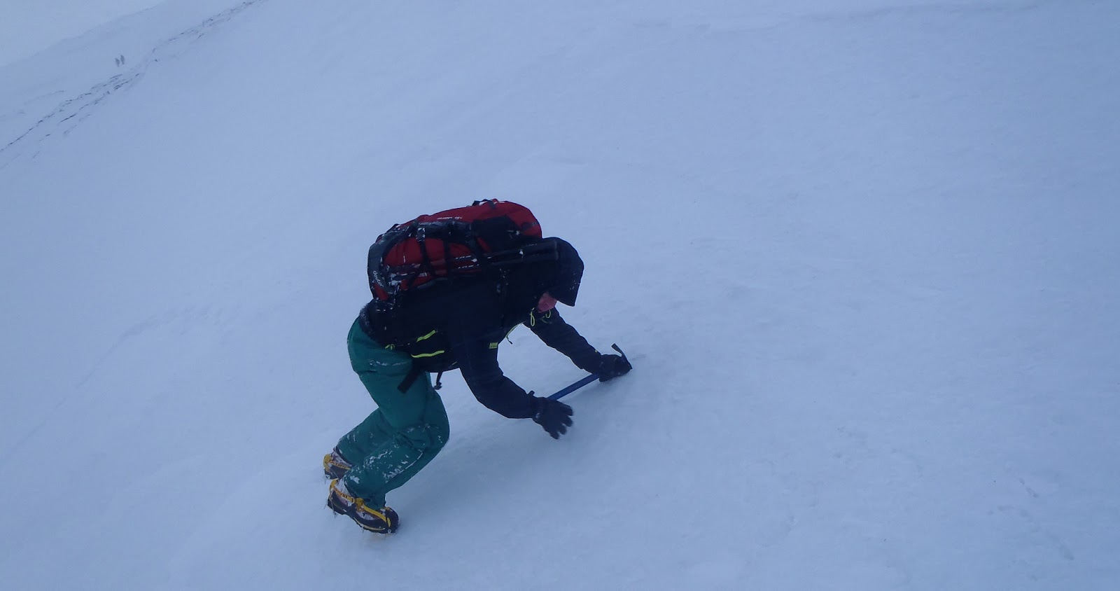 Jagged Globe - Winter SummitsToday I met Linda, Anna and David to start their week course with Jagged Globe. Today we went to Aonach Mor, enjoyed the Gondola ride and soon got out into the blowy weather to revise some of their movement and decision making skills. There was a great deal of snow making movement difficult, and I soon found myself breaking trail again (joys!). We soon had to put crampons on because where the slab is thin, the old snow ice is just below. We had a look at using crampons on snow ice, water ice, and rock, before moving steeply up to the ridge - where the wind nearly turned Anna into a kite! Later in the day I tried really hard to slide down the slopes, but can you slide when you want to?! - So I guess we'll do ice axe arresting another day.