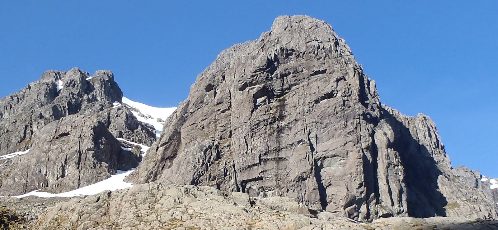 Carn Dearg Buttress with Centurion just right of centre in the photo, starting in the shadowed corner