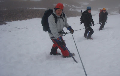We quickly took in the summit of Stob Dearg. We talked about turn around times on big mountains. Barrie is soon heading off for Lhakpa Ri, and so we adopted a turn around time for our summit and got to the top with 3 minutes to spare! Back down again we talked about how to get down steep slopes and abseiled off our snow ballard. Here is Barrie enjoying the abseil.