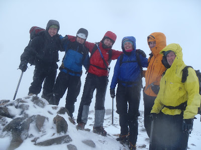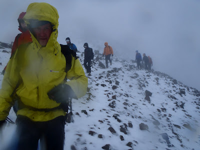 Winds were forecast to strengthen towards dusk, but we managed to get to the summit in only moderate winds, but by now the temperature had risen and so we were in the rain - but happy.
