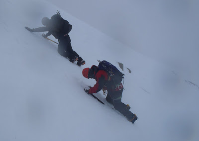 On Saturday I met Chris, Elliot, Gareth and Tim ready to start their weekend of winter mountaineering. We put together a plan for the weekend to meet their needs from the course and to hopefully help them prepare for some future mountaineering plans. We started in Coire an t-Sneachda revising some winter skills, kicking/cutting steps, self belay, ice axe arresting, then moved onto footwork with crampons. We were finally ready for the steeper ground where we continued to look at the snowpack and avalanche avoidance. The thaw is taking it's toll on the surface snow, which is now soft and melting. We later looked at route choice options, and a few safe travel techniques before moving to descent techniques.