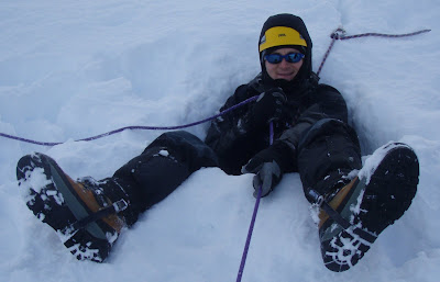 Day 4 of our maountaineering course. We opted for a day for developing skills on Glencoe Mountain. A day for slipping, sliding and snow anchors. Surprising how much fun you can have trying to destroy buckets and buried axes..