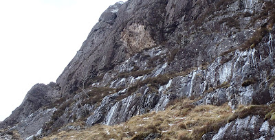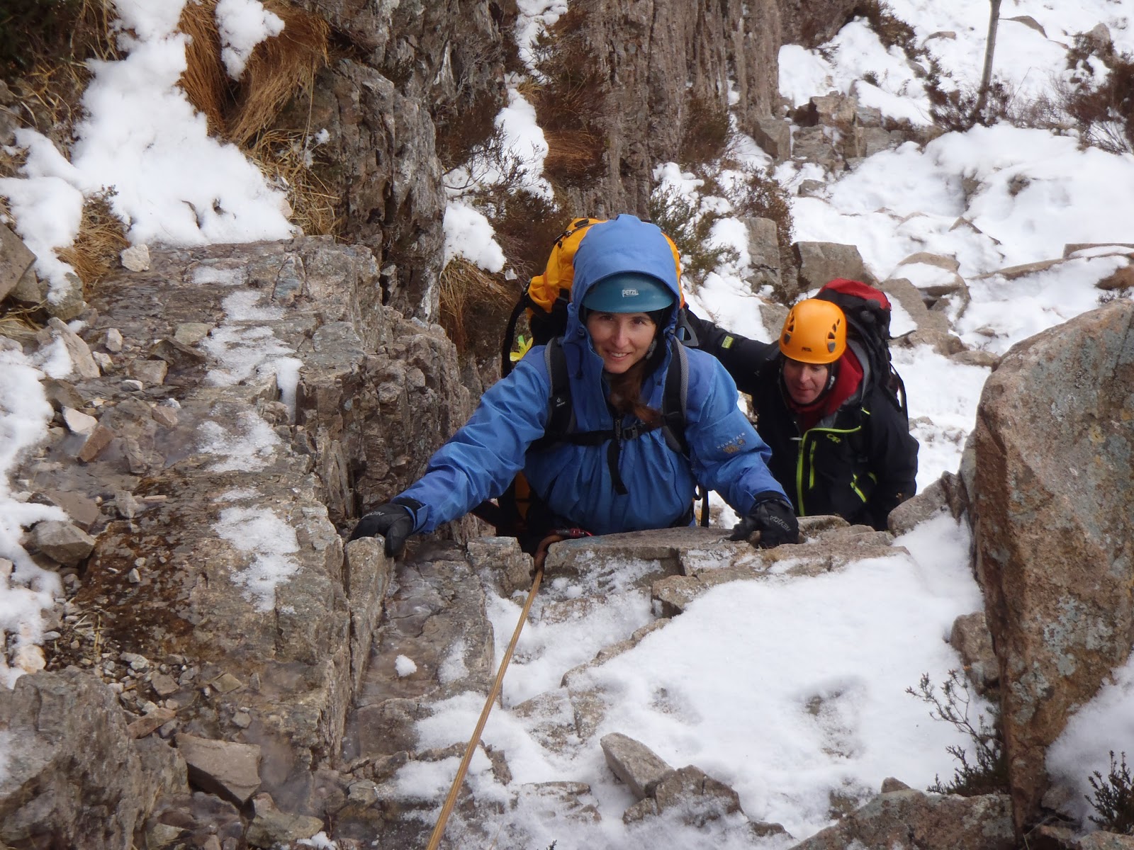 Today on day 2 of the Winter Summits Course, with a forecast of strong winds we went for a climb of the Zig-Zags on Gearr Aonach up into Stob Coire nan Lochan. Linda, David and Anna all want to use this course as a stepping stone for preparation for the Winter Mountaineering Course next year, and also for their expeditions in the next couple of years. With that in mind we're doing a few grade I climbs this week. We were in the shelter from the winds for most of the day, but got some winds of about 30mph near the top of Gearr Aonach. The walk across the top into Stob Coire nan Lochan involved a little post holing (fun!) where there was a lot of deep flat slab. I always sank into the slab, making every step hard, but Anna and Linda seemed to be able to walk on the surface without sinking at all - not fair - how heavy am I ! On the slopes down into the lower coire I was glad of an opportunity for a good glissade/bum slide - but we used half of the slope as a quick venue for looking at ice axe arresting. With better weather on Wednesday the team are up for a bigger adventure..
