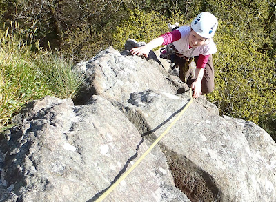 After lunch I took Catrin up Poor Man's Peuterey (S ***) to get to the top of the cliff for some top-roping. Catrin found the climb straight forward except for the 'snake belay' at the end of pitch 2 - where she calmly told me to 'hurry up, beacuse there's a snake here!' - so I belayed just above the 'nose' to get Catrin away from the trees, snakes and general wildlife!Catrin on the last pitch of Poor Man's Peuterey