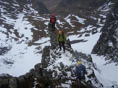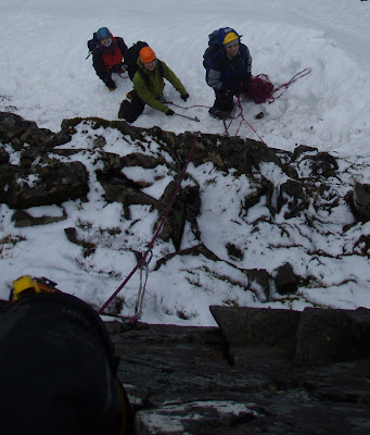 So this weekend I met Chris, Helen and Jack. They're here for a quick hit of winter Scottish Mountaineering. So, day 1 of putting crampons on or using an axe the guys were on a steep learning curve... We headed for Dorsal arete on Stob Coire nan Lochan. The guys wanted a challenge so here we go .. (Chris on the left, Helen in red, Jack in Green).