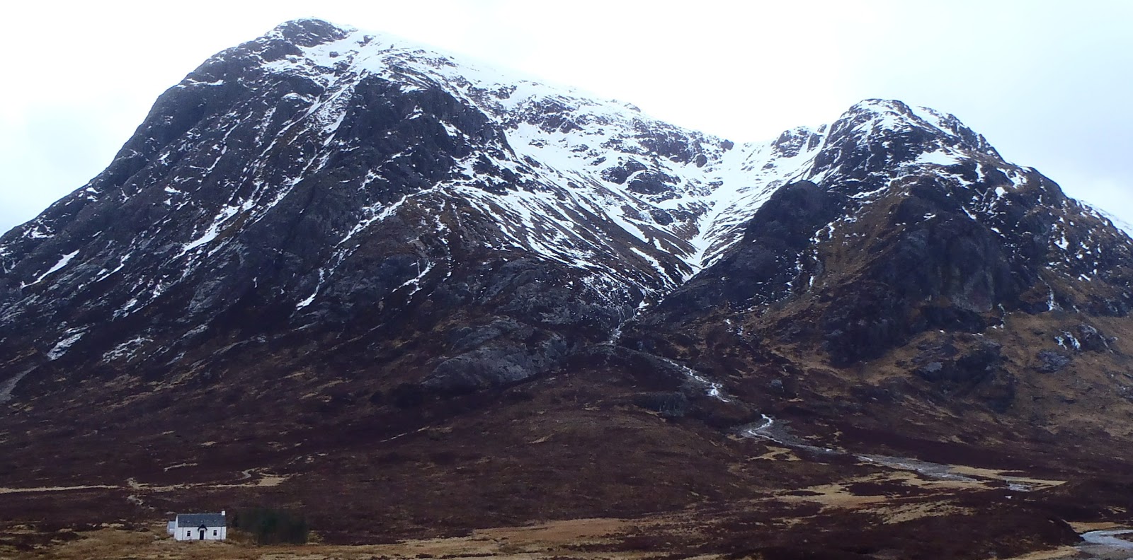 | The Buachaille on SUNDAY 14th. Today on Tuesday 16th, there was much less snow on the mountain, the white snowy gullies have receeded upwards, and they all ended in streams heading towards the river. |