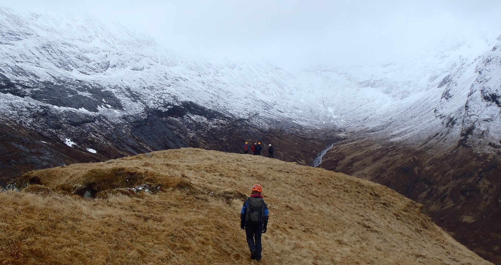 WHC, UHIToday I was working with Gillian Culshaw and the First Year ATM Degree Course students - on their assessment of Leadership on the hill. We wanted to keep below the low snow line, and yet still have a simple scramble to a summit with a little nav back to the van, so we headed to Glen Nevis and Meall Cumhann, which was just below the snow line, even though it's only at 698m. The students had to plan the route, manage the safety and the group and demonstate different effective leadership styles and communication. Well done to the whole team. We had some wintery showers low down, which would have been a little more snow higher up. On the higher hills winter is still here...