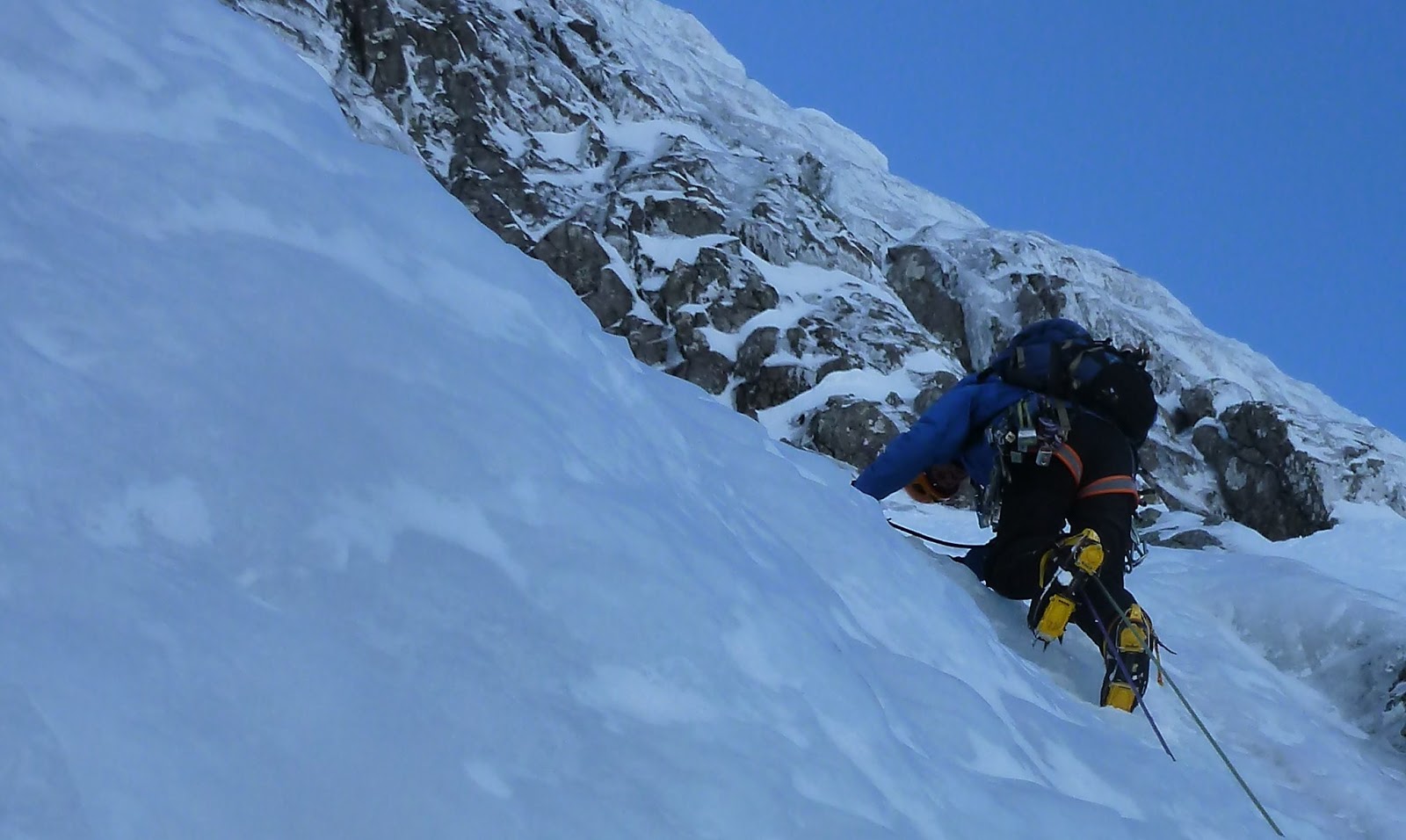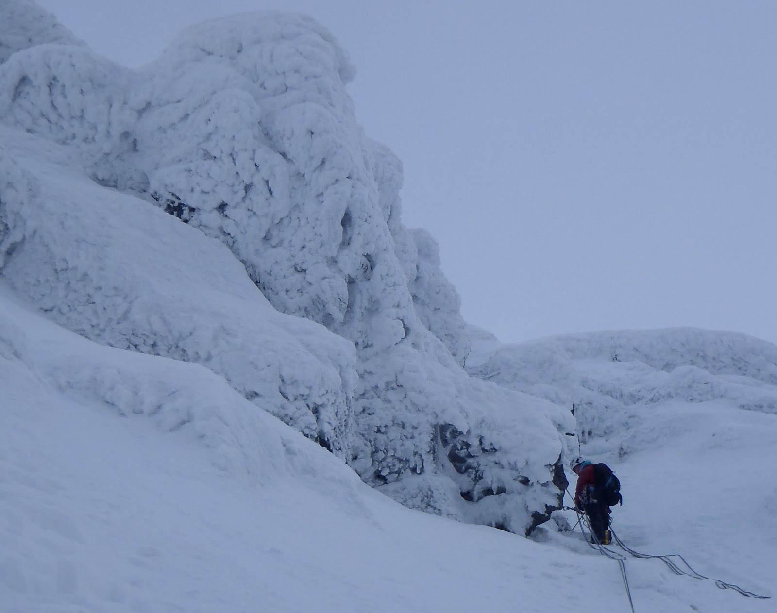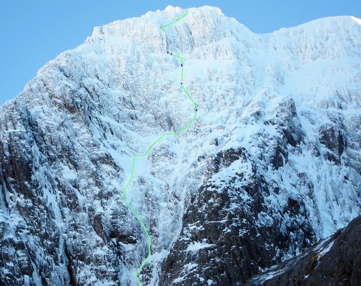 Today Lena and I headed up the Ben track with a few plans. These plans narrowed down to just the 1 after chatting to Mike and Guy at the CIC. We finally decided on Orion Direct. We got to the start just after Mike. At the first belay Lena decided that she wanted pitch 1. Pitch 2 was icy grooves heading up to the nut belay on the left. Lena wanted pitch 3 up into the snow field, this is where she found out exactly how long a 60m rope is (not quite 70m). Pitch 4 took us to the nut belay before the crux. The crux was excellent, exciting, a little thin and poorly protected. A couple more pitches took us up to Lena's belay before the chimney. This turned out to be my favourite pitch. In the end we got to the top in 10 pitches, sharing leads. A pretty great day out, especially when Orion Direct wasn't even plan A! There weren't that many teams out on the hill today, but there were 3 teams on Orion, 5 on Point 5, teams on Tower Ridge, Slav Route and Minus 3 gully. An awesome day.