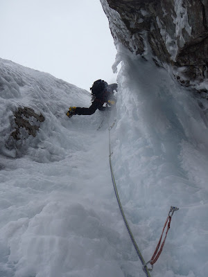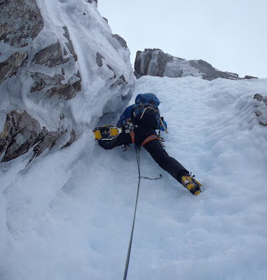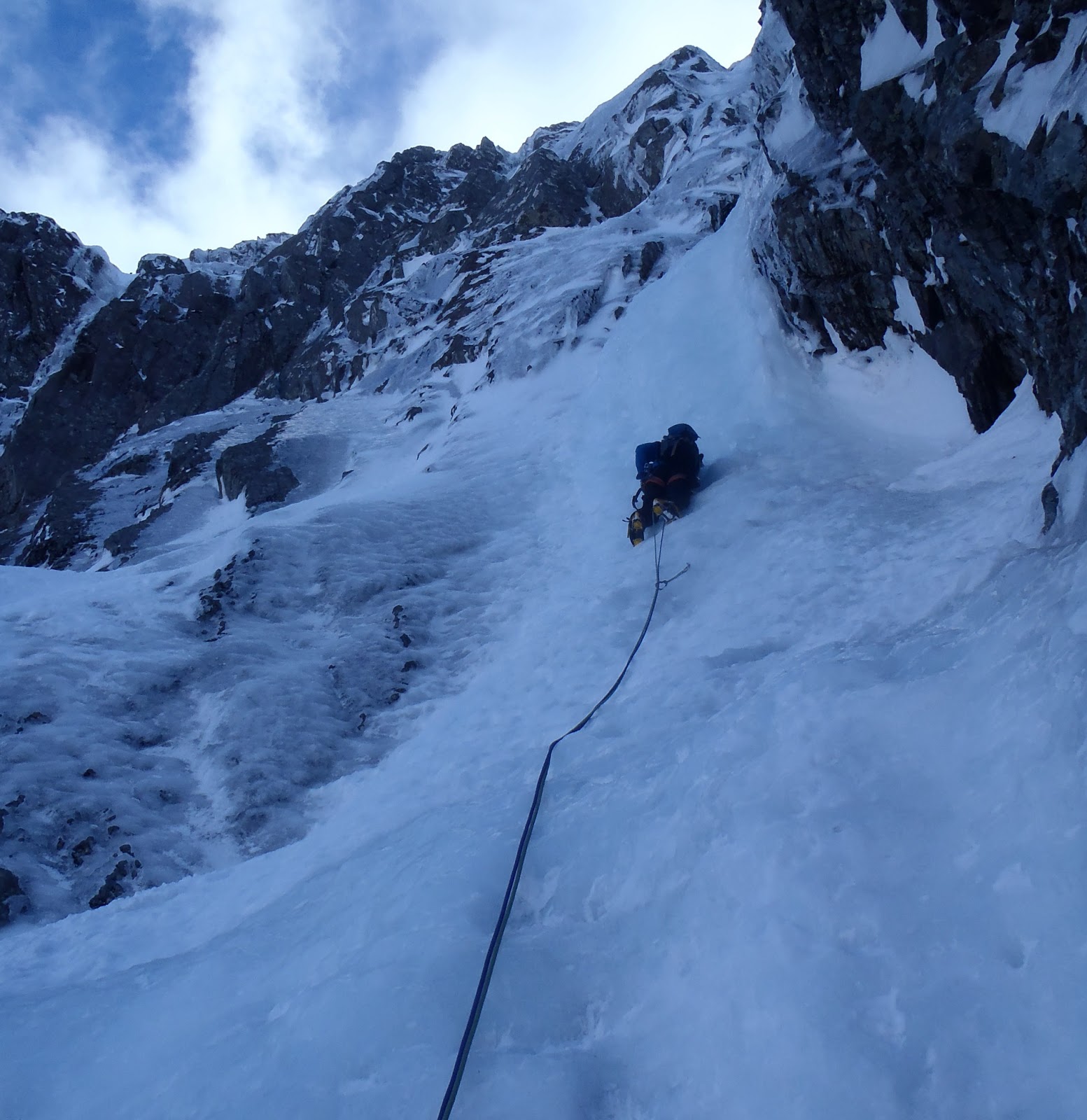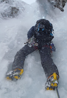 Lena sets off on the Rogue pitch as spindrift comes down |