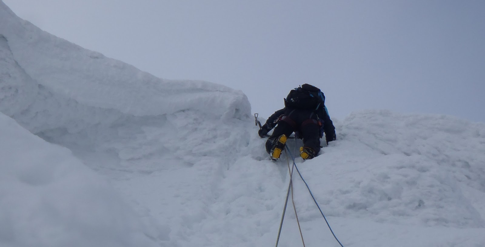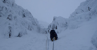 | Lena sets off on the Rogue pitch as spindrift comes down |
