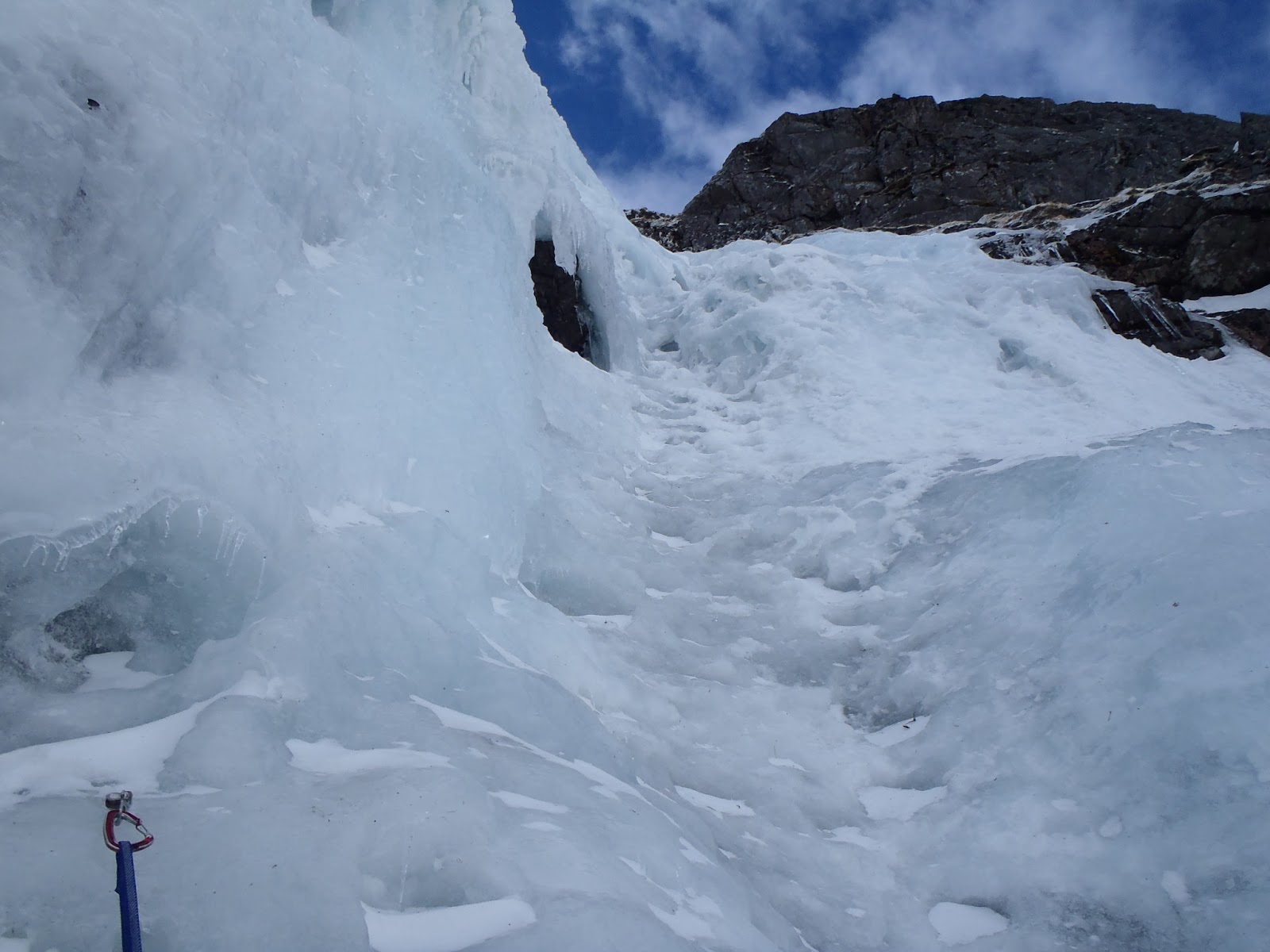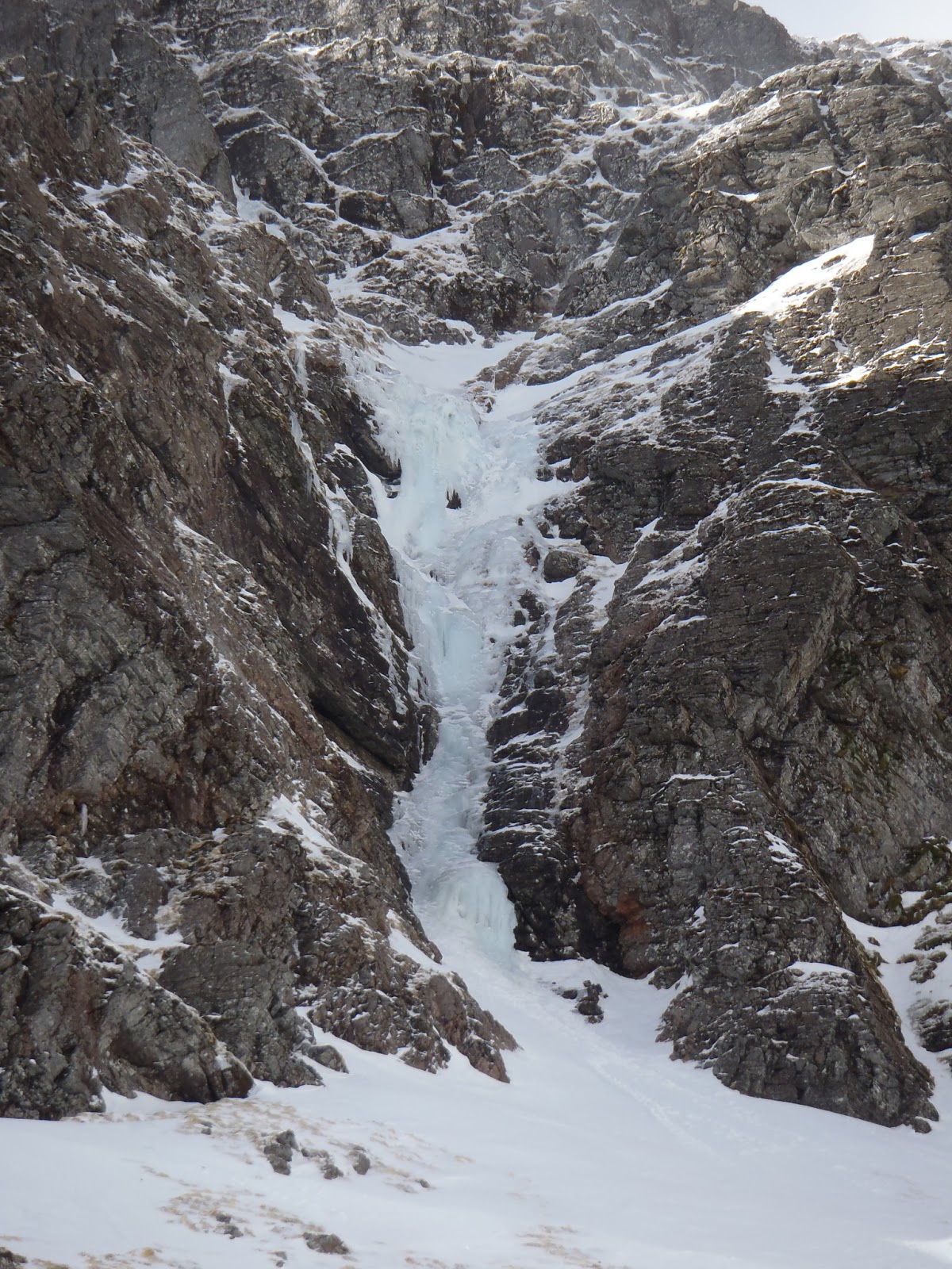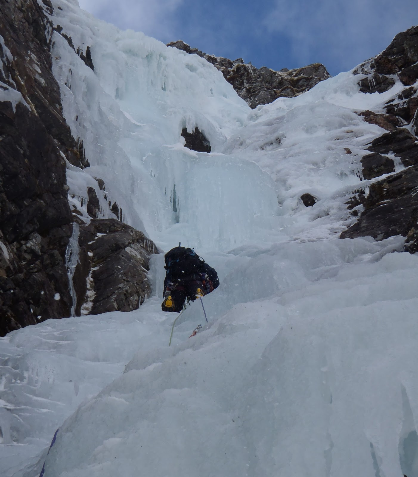Once on The Pumpkin, we found the ice to feel fresh (it wasn't stepped or full of hooks), and there were almost no ice screw holes (unlike lots of the ice climbs on the Ben at the moment). The ice was pretty brittle and a little care was needed on the first pitch. One particular axe placement turned the ice into a water fountain, so quickly Lena put her axe in again to plug the hole! The steepening at the end of the first long pitch had a few hooks and a couple of steps, but mostly it felt like fresh water ice. The steepening on pitch 2 felt a little more stepped. We did the climb in 7 pitches. A great climb.