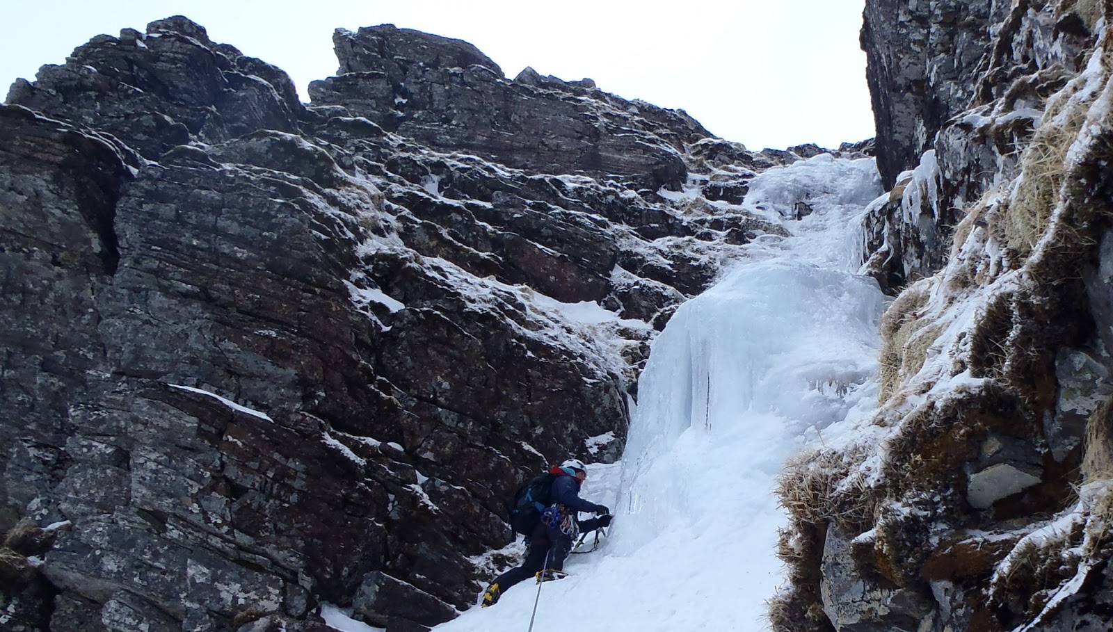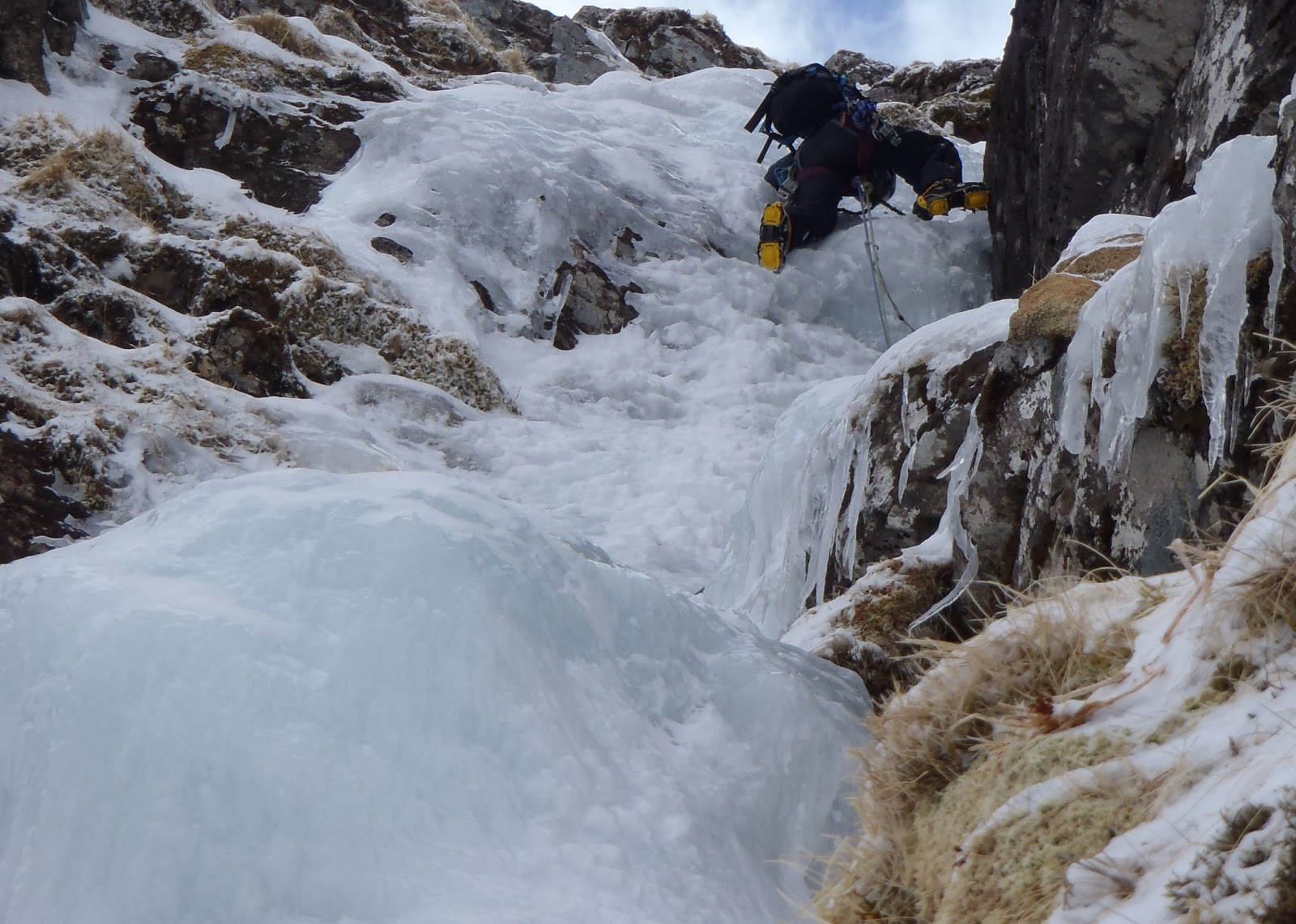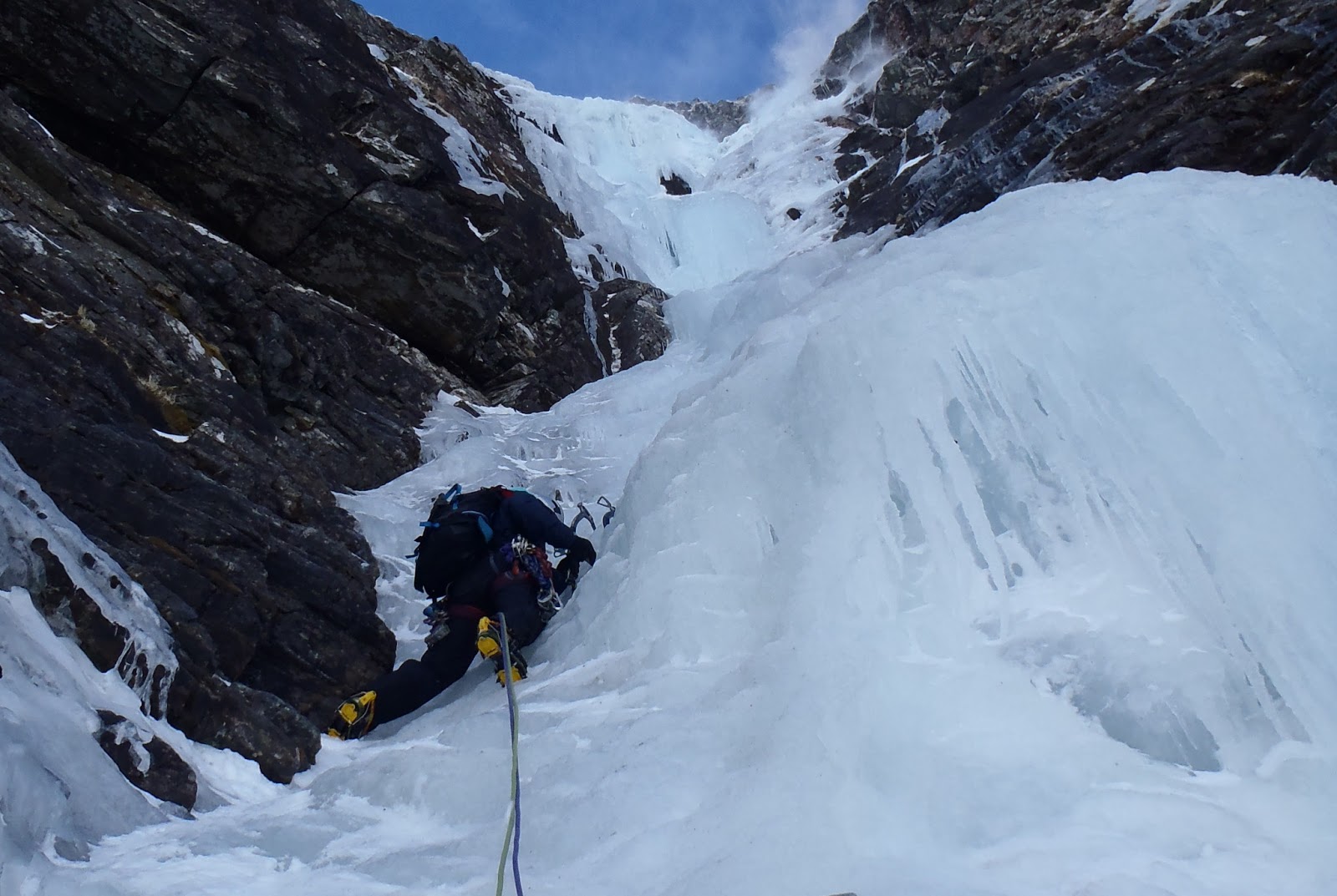 Once on The Pumpkin, we found the ice to feel fresh (it wasn't stepped or full of hooks), and there were almost no ice screw holes (unlike lots of the ice climbs on the Ben at the moment). The ice was pretty brittle and a little care was needed on the first pitch. One particular axe placement turned the ice into a water fountain, so quickly Lena put her axe in again to plug the hole! The steepening at the end of the first long pitch had a few hooks and a couple of steps, but mostly it felt like fresh water ice. The steepening on pitch 2 felt a little more stepped. We did the climb in 7 pitches. A great climb.