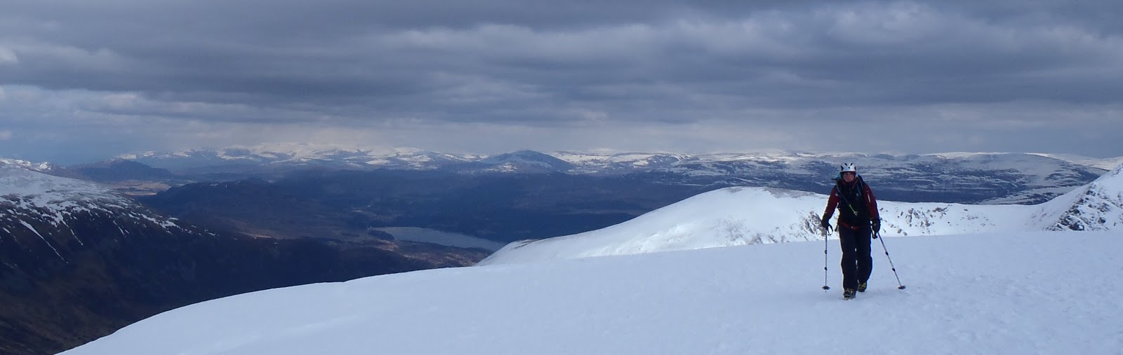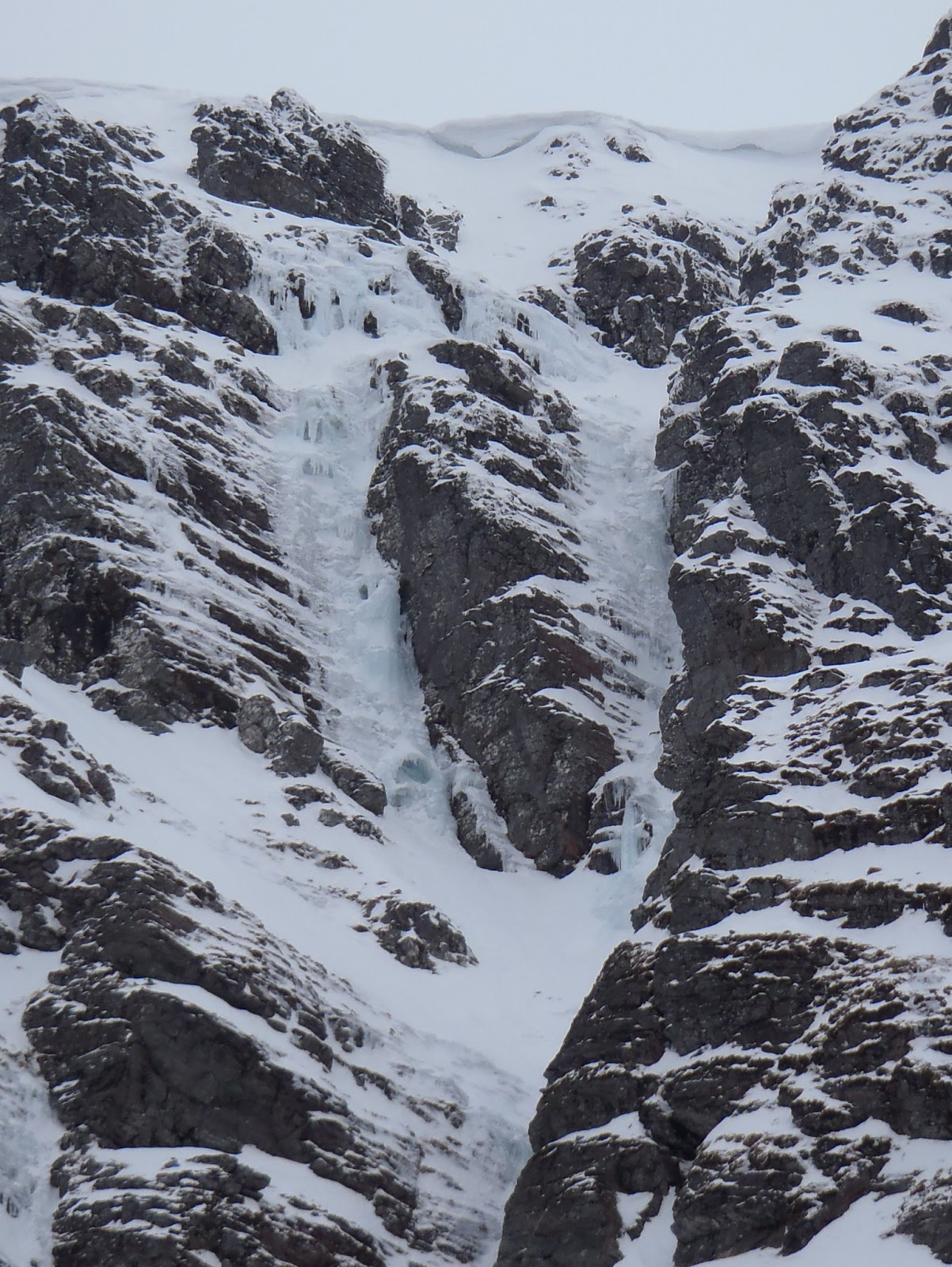 Creag Meagaidh is in good condition. Lena and I set out to do Smith's Gully, but another team got there first. We chose not to follow them because we didn't want a day of queueing with snow and ice pieces falling on our heads - so we headed of to the deserted Inner Corrie and found The Pumpkin in good condition. We could have chosen almost any ice climb today - South Pipe Direct, The Wand and Diadem also looked great. Lots of other climbs looked good today, but my first Meagaidh climb years ago (with Rich), Staghorn Gully didn't look complete with snow.