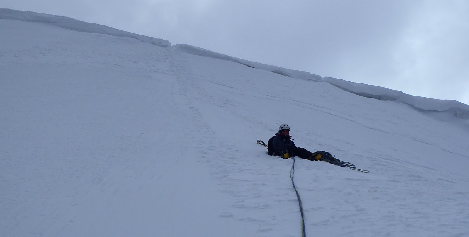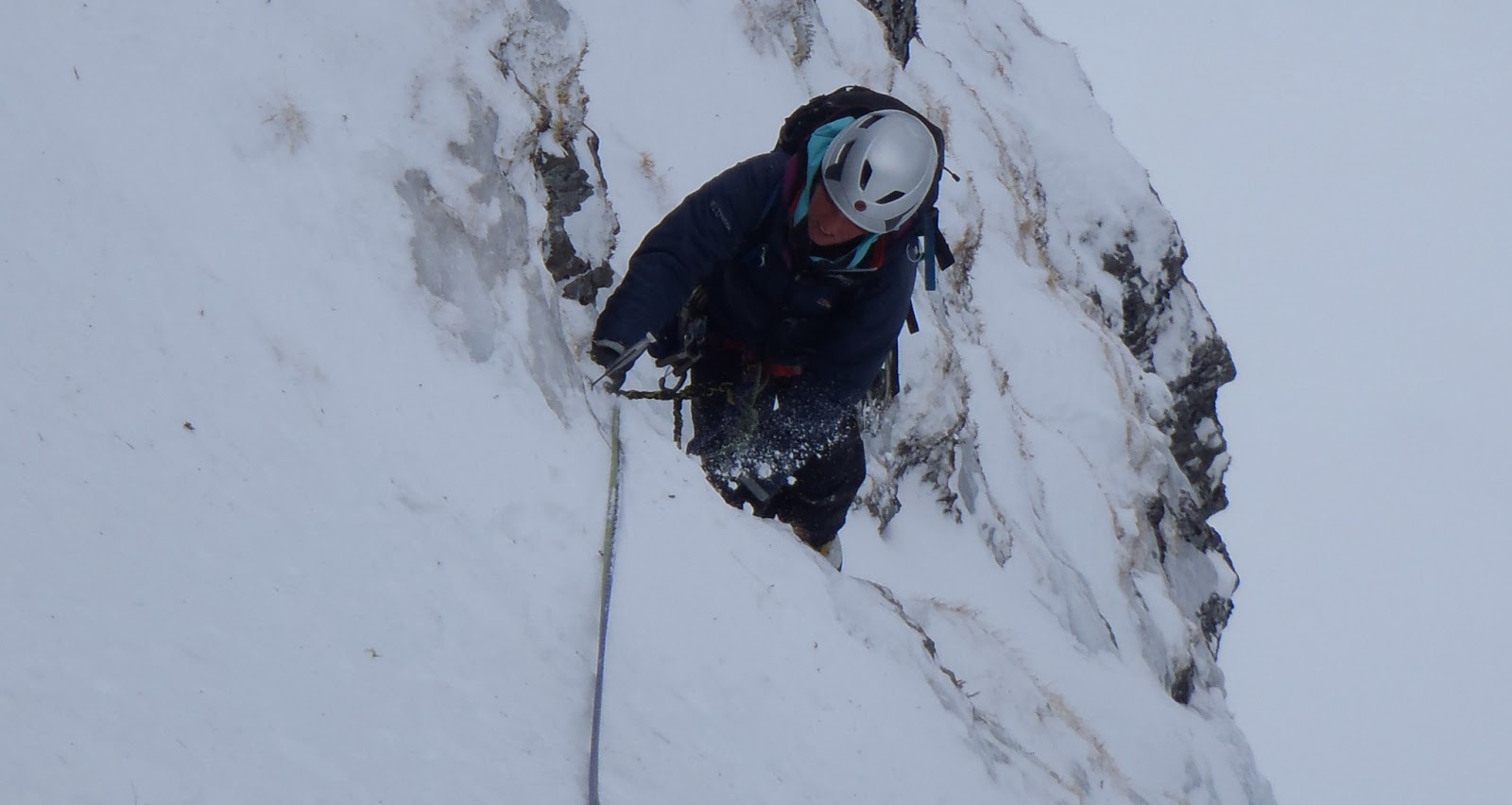 After the steep ice, Lena about to set onto the snow slope, midway through the route |