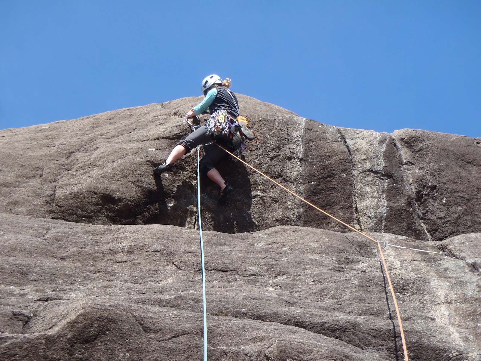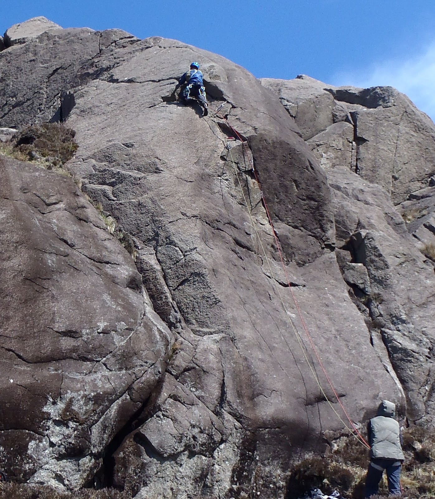 We all decided to head back to Meall an Fhir-Eoin for our second day (most people's 3rd day). It's a place where everybody can choose a climb to suit them (lots of slabs, walls, corners, and overhanging cracks), and still chat to the neighbouring teams. Lena started on Ring of Fire which is a varied, excellent HVS - on perfect rock again.