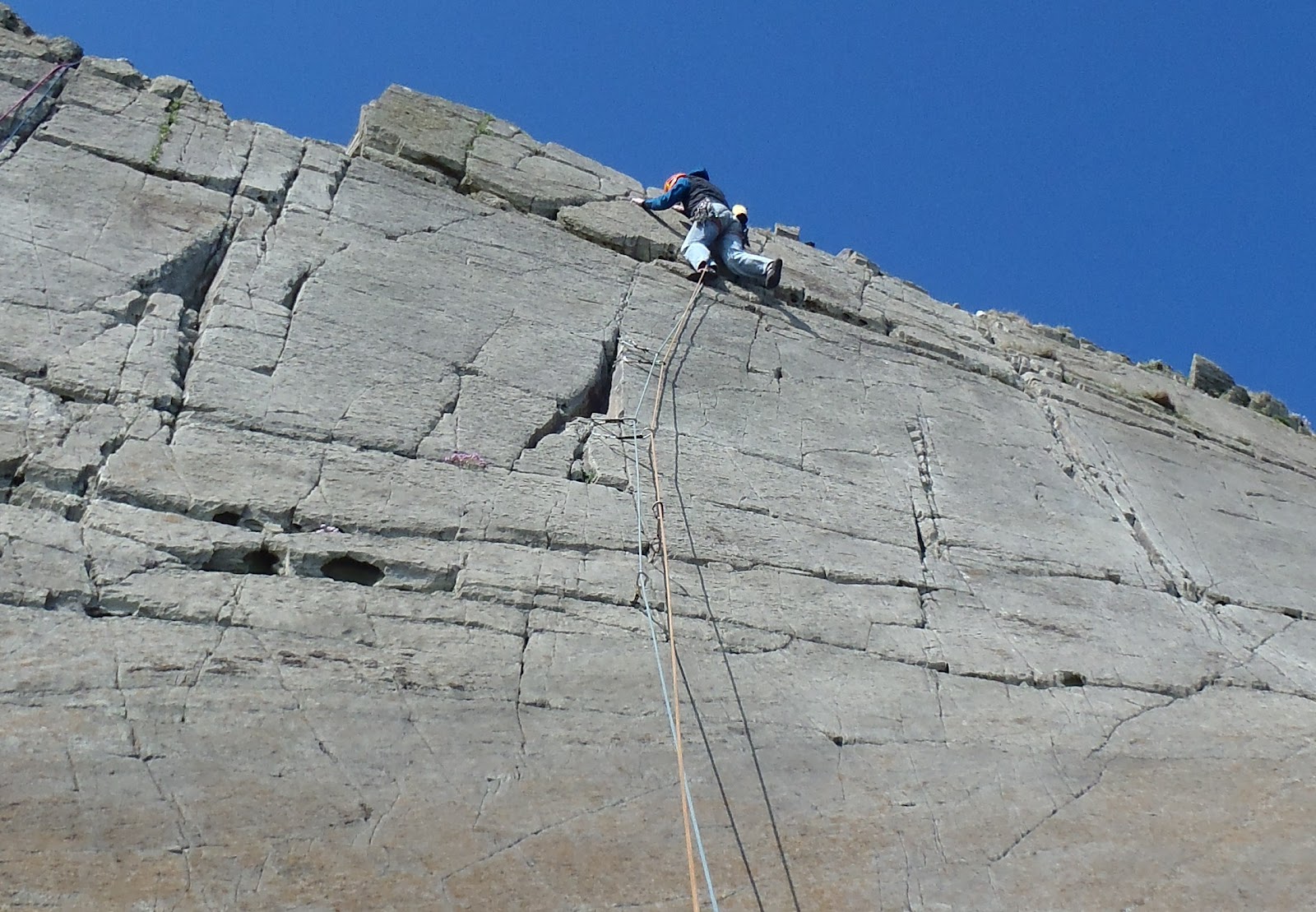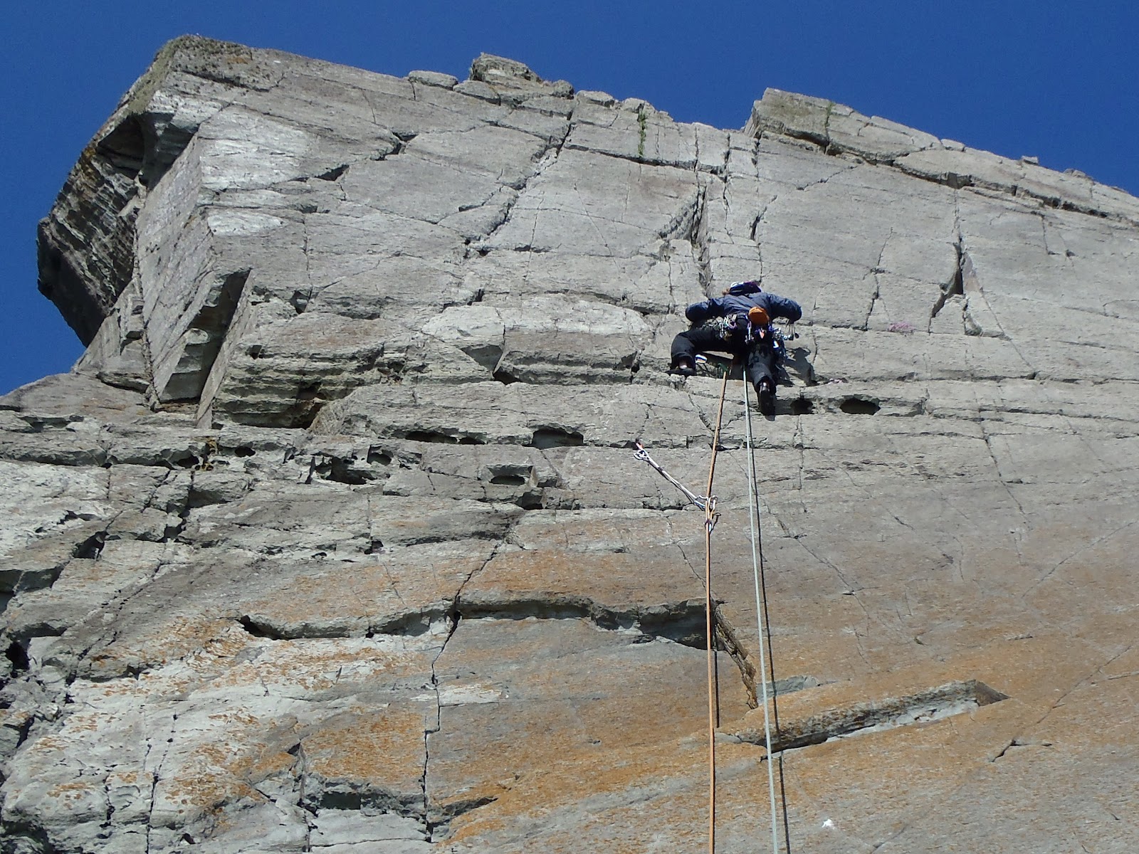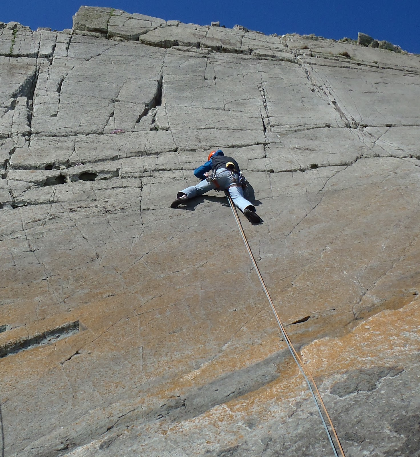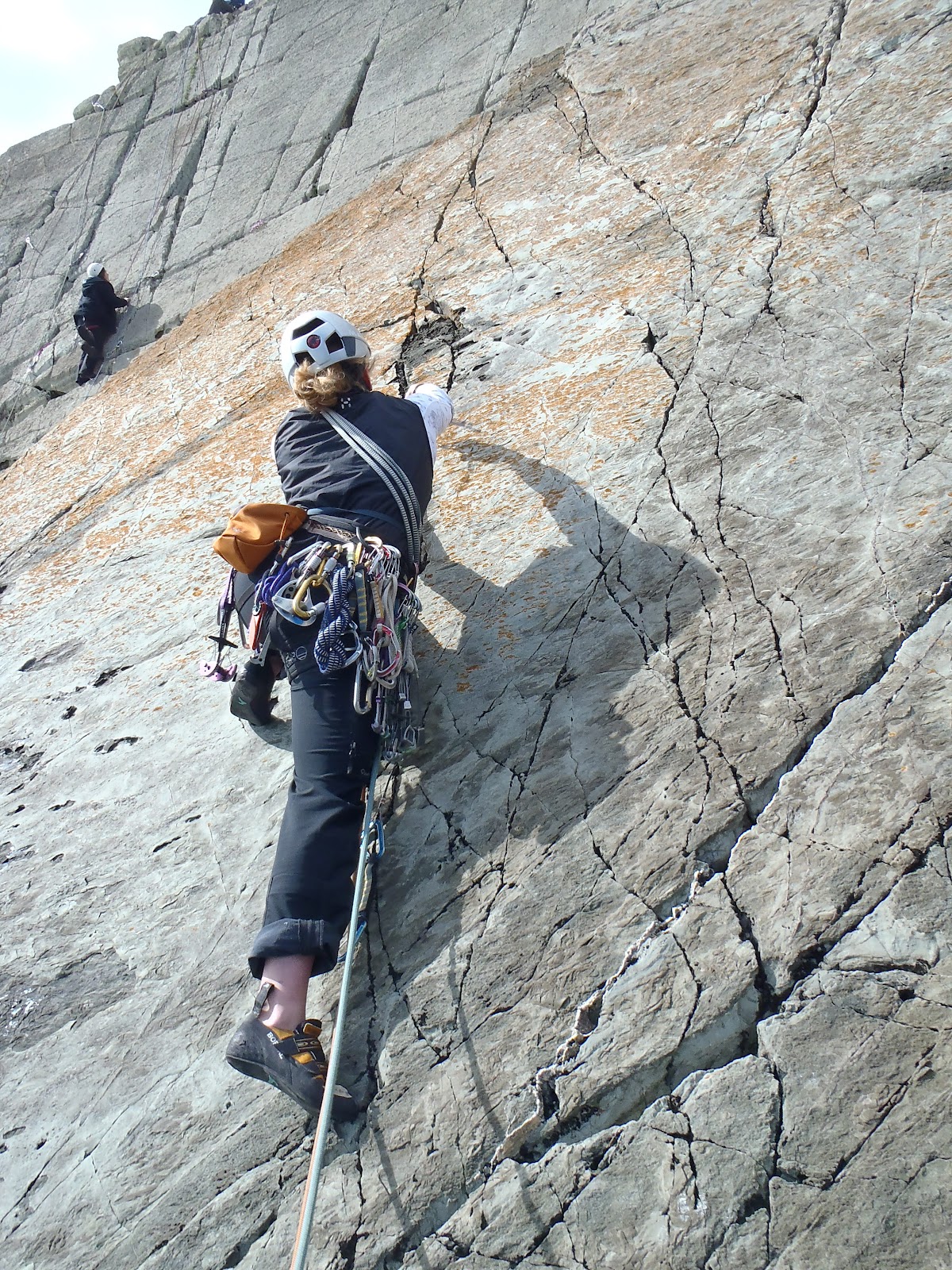 We were searching for sun, clear skies and an end to the rain at the end of April. North Wales was still cold and wet, so we headed down to South Wales and chose Craig Caerfai in Pembrokeshire to start. However, a University climbing club had also chosen the same crag, so it was busy busy. Liking slabs, I started on Orogeny (E2 5b**). The climbing is thin to start, but the rock was perfect.