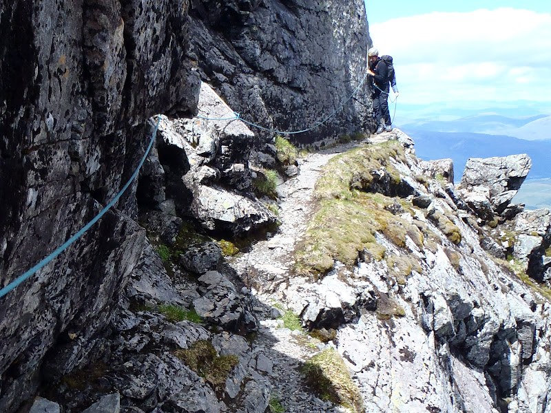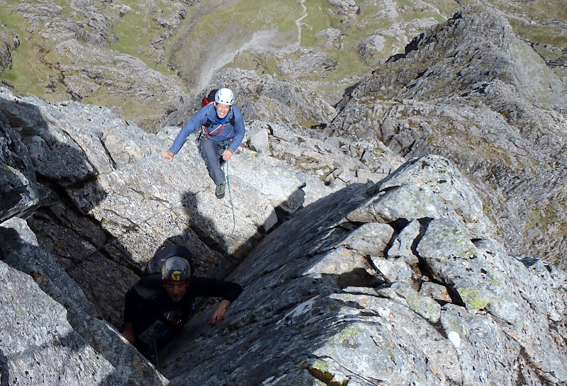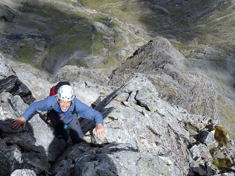 I started wearing sunglasses at about 8am driving through Fort William. The day started warm and got better! We made our way up to CIC for an ice cool drink, and went around to find the East Gully of the Douglas Boulder, to access the Douglas Chimney to start the ridge. Dan showed a few nerves at the exposure, but his indoor climbing paid off and he cruised up the chimney, and stepped onto the ridge in the sun.