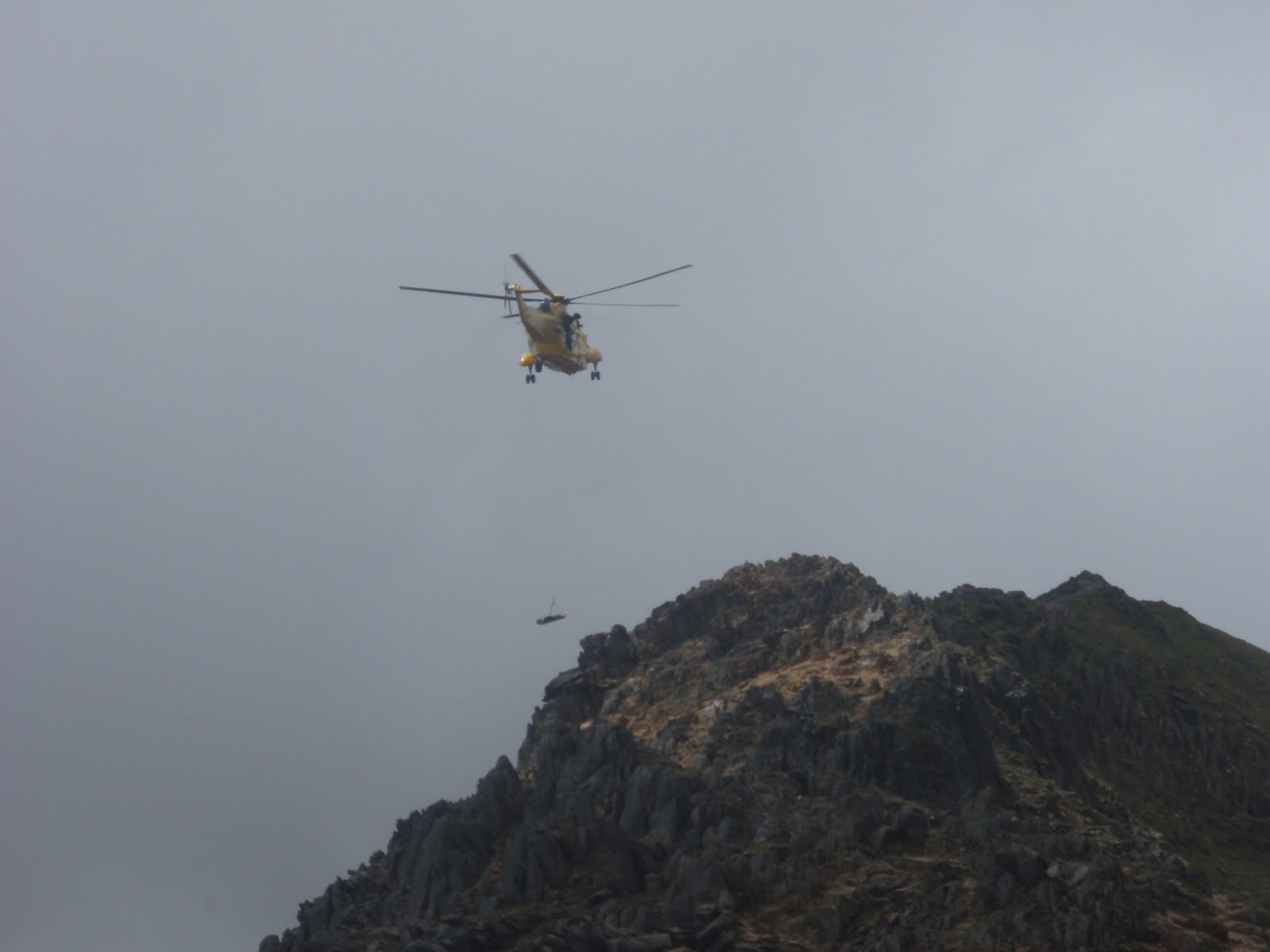 After Garnedd Ugain along Crib y Ddysgl, I came across a couple of men who seemed to be sunbathing! About 2 minutes later the helicopter arrived to evacuate the man with an injured leg.