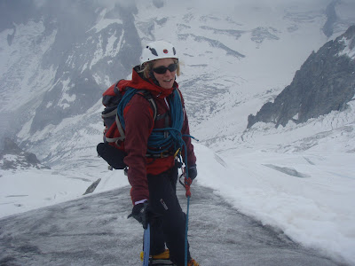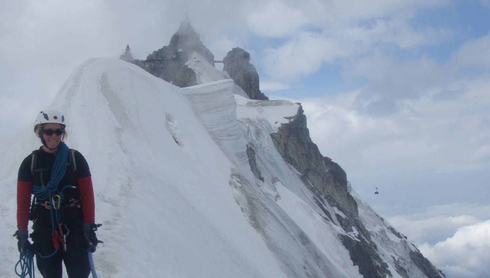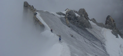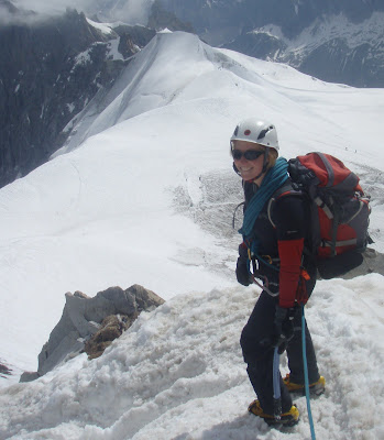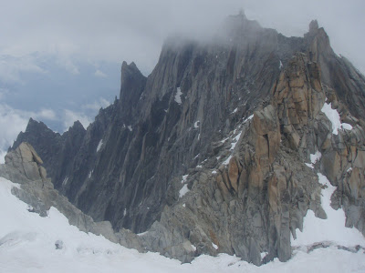Today was the day for altitude and snow, but hopefully in safety away from rock/ice fall. We chose the Midi Plan Traverse. After research in town the day before we knew that it had changed significantly after the last couple of weeks, and it had been stripped of much of it's snow, leaving bare dangerous scree slopes in places. These could however be negotiated safely - just! The weather did show that an afternoon storm was on it's way, so definitely a day to know when to turn around! As predicted we found that the snow was in fact ice for much of the traverse. It was a day where so often in the alps, the weather can change in minutes from blue skies one min, to storm clouds and lightning the next min!