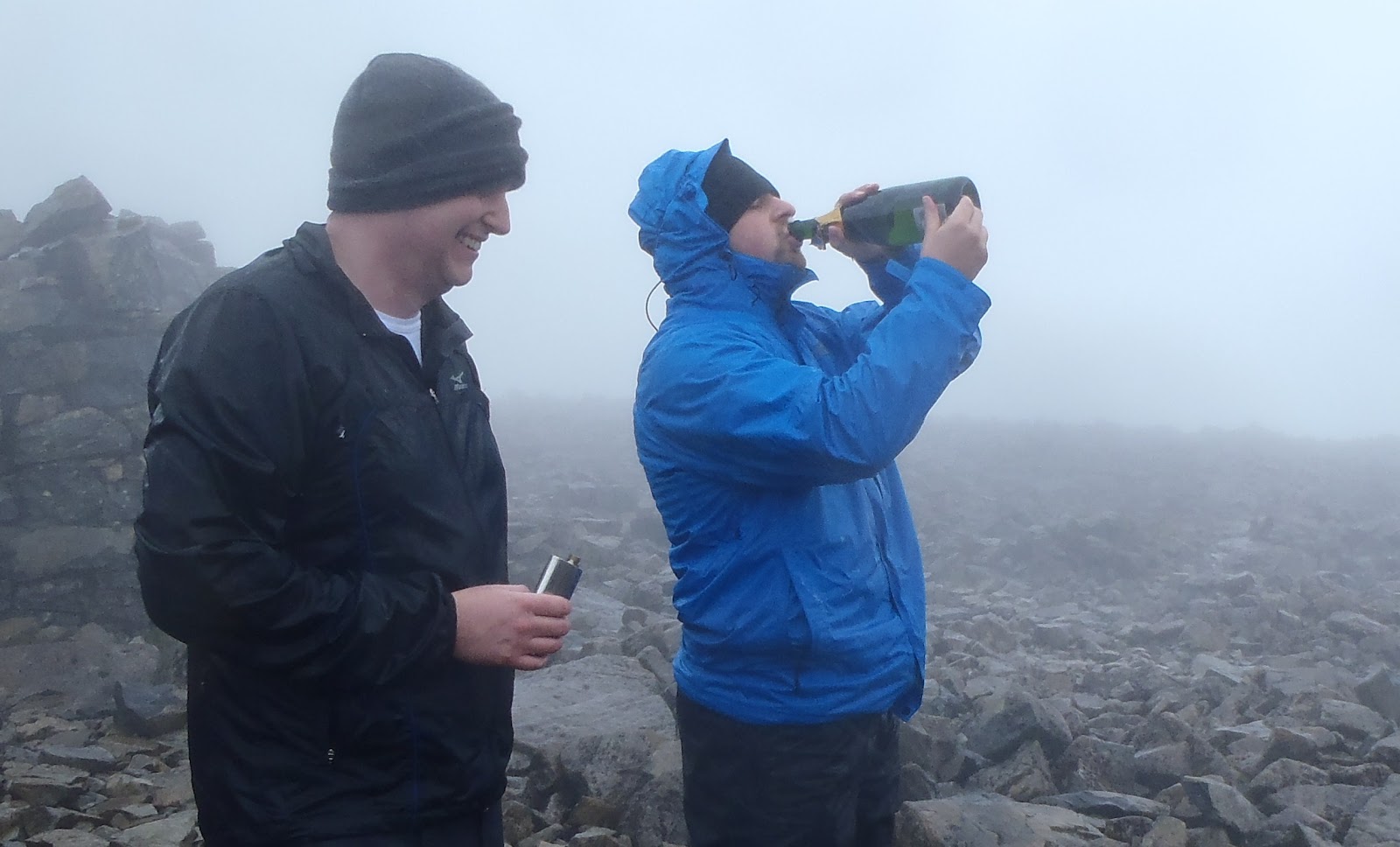 On Saturday I met the hillwalking team from 'GE Oil and Gas' to walk up Ben Nevis. Johann Urbano was working with us for the day. It wasn't a great forecast for the day, infact when I was getting dressed rain was whipping against the windows. With warm clothing packed we set off up the track. As we left the valley and got to the upper half of the mountain we entered the cloud and visibility dropped, and the rain started once again. In no time at all we got to the summit, and with nothing to see, the team pulled out of their bags their essentials - Champagne and Whisky to celebrate the summit that only 2 of them had been to before.