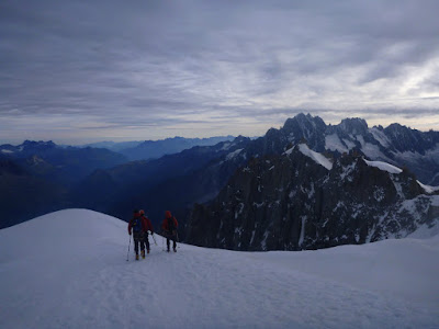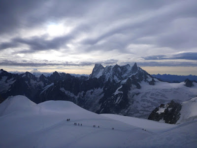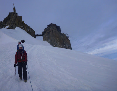 Matt abseiling down the mixed slot. As we started to walk across the Vallee Blanche, the cloud hit us and vis went down to 40m. Lena led the team into, and across the white. After lots of walking in the white room, we popped out on the other side of the Vallee, converging with other teams of ants appearing from the cloud and took our place on the ridge to the summit. As it turned out we weren't the only team to turn back due to the poor weather. I was glad that we made a timely decision. It was a great day. This was the end of Matt's holiday as he had to get a flight at 7.30am the next day..