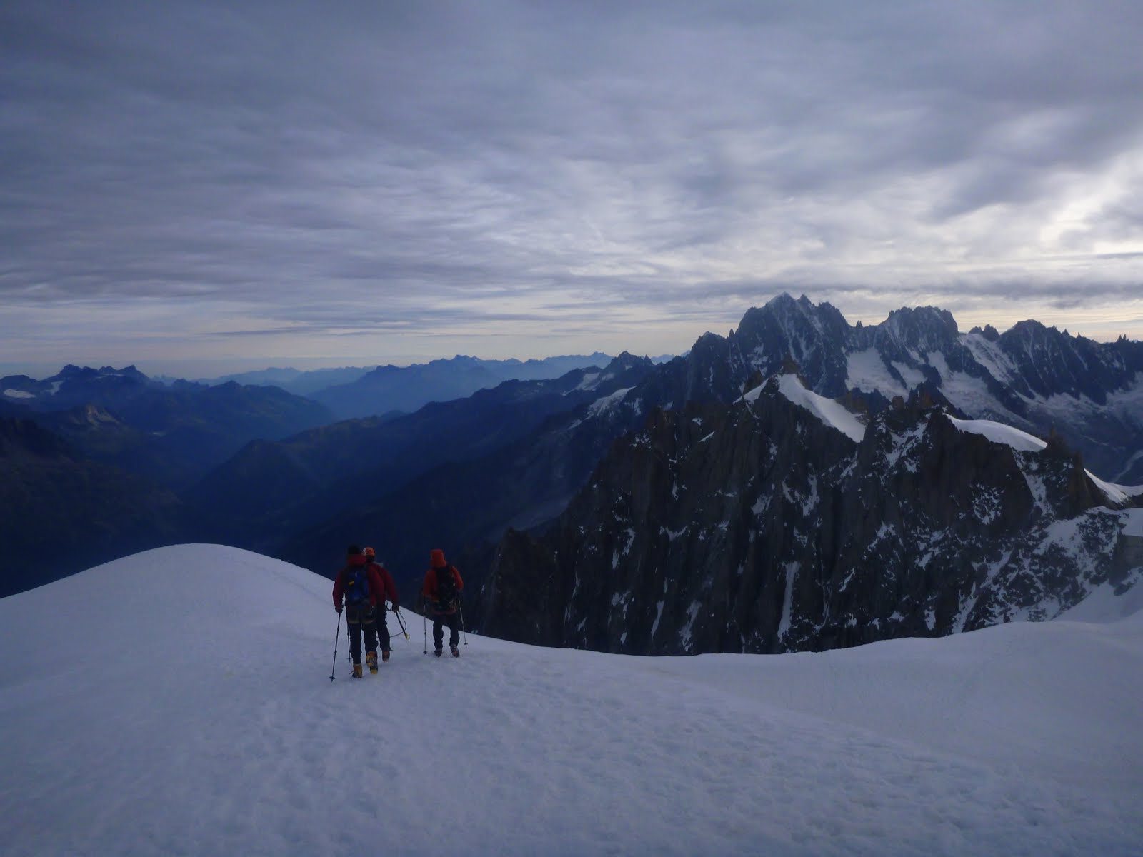 Matt, Lena and I headed up the Aiguille du Midi telepherique with the intention of climbing the Left Edge on Mont Blanc du Tacul, our second climb as a rope of 3. As usual it was CRAZY busy in the bins to the top, and there was all the normal madness on the snow ridge heading down to the Vallee Blanche.