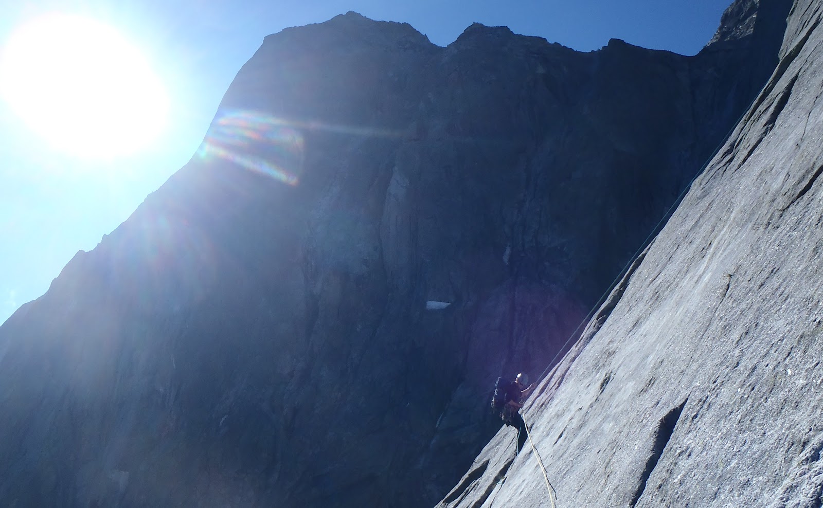 Early in the morning, just after dawn, the Rebuffat Diedre 5a. It was damp and saw many people falling off it. |