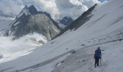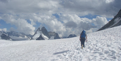 Of course the downside of crossing a glacier at this time of day, is that the snow is very soft and the integrity of crevasse snow bridges is doubtful - so we took care over about 10 soft bridges.