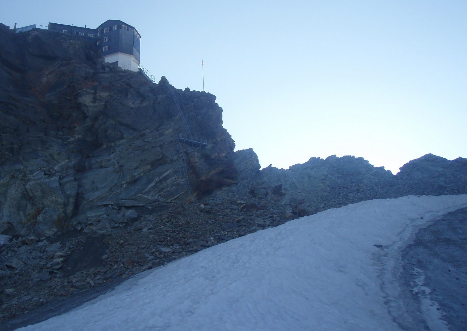 The hut was fairly busy, but now for 2011 they have opened their new toilet block, which is VERY impressive and modern except for the processing of men's wee! - It's just fed down a 10m pipe, causing the whole cliff to smell, until for the rain! Above is the West view of the Bertol Hut, the next morning. The hut can only be accessed from the E or W via a series of ladders. The hut stands exposed at 3311m on a shoulder of the Clocher de Bertol.