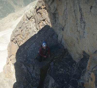 Lena Brune and I made our way up to the Tsa Hut (at 2607m), below the W face of the Pt de Tsalion, on the Grands Dents Chain, overlooking the Arolla valley. For the next day we chose as our objective the Red Gendarme (D-), on the West Face. We also decided to extend our day after the climb, to get to the Bertol Hut (at 3311m), at the southern end of the Grands Dents Chain, via the Pointe de Tsalion, Dent de Tsalion, Aiguille de la Tsa, Aiguille glacier, col de la Tsa, Pt de Bertol, Upper Mont Mine glacier and the Col de Bertol. However this meant that we would have to carry crampons, axe, and a few extra things during the climb - hardly a light sac ascent! Above Lena is seen in the prominent steep Red Gendarme chimney.