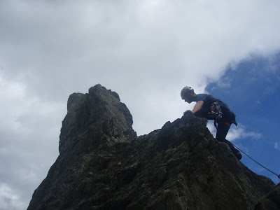 We had a couple of hours to kill, so we went looking for the Satarma Needle near Arolla. It was easy but entertaining. The guide book says you need a couple of slings and some nuts, but there are 5 bolts en route and a mass of bolts at the top, so little is needed.