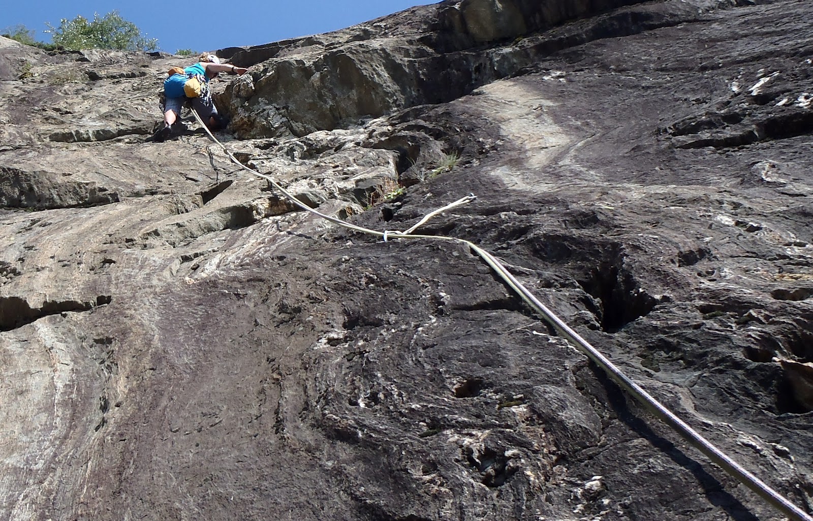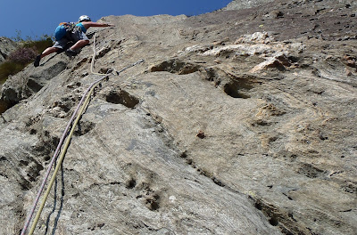 Before we had to leave Valle d'aosta we had 1 more day of good cimbing weather, so we decided to do Tommy on Mont Charvatton. This is a 14 pitch route so we started early, and seemed to be first to the obscure parking spot. A team was hot on our heels, parking shortly after us. At this point I realised that for a week or so there had been no competition for our routes, but suddenly - there was a croud. At the route, there was already a team 3 pitches up. The team behind us had caught us at the end of pitch 1. They were climbing better and faster than us, so at the end of pitch 2 we let them pass through. So then away from the crouds we were able to enjoy the route. Pitch 2 was the technical crux and pitch 3 was the gymnastic crux (at A0), but the 6th was my favourite - the moves were just so good on perfect rock.