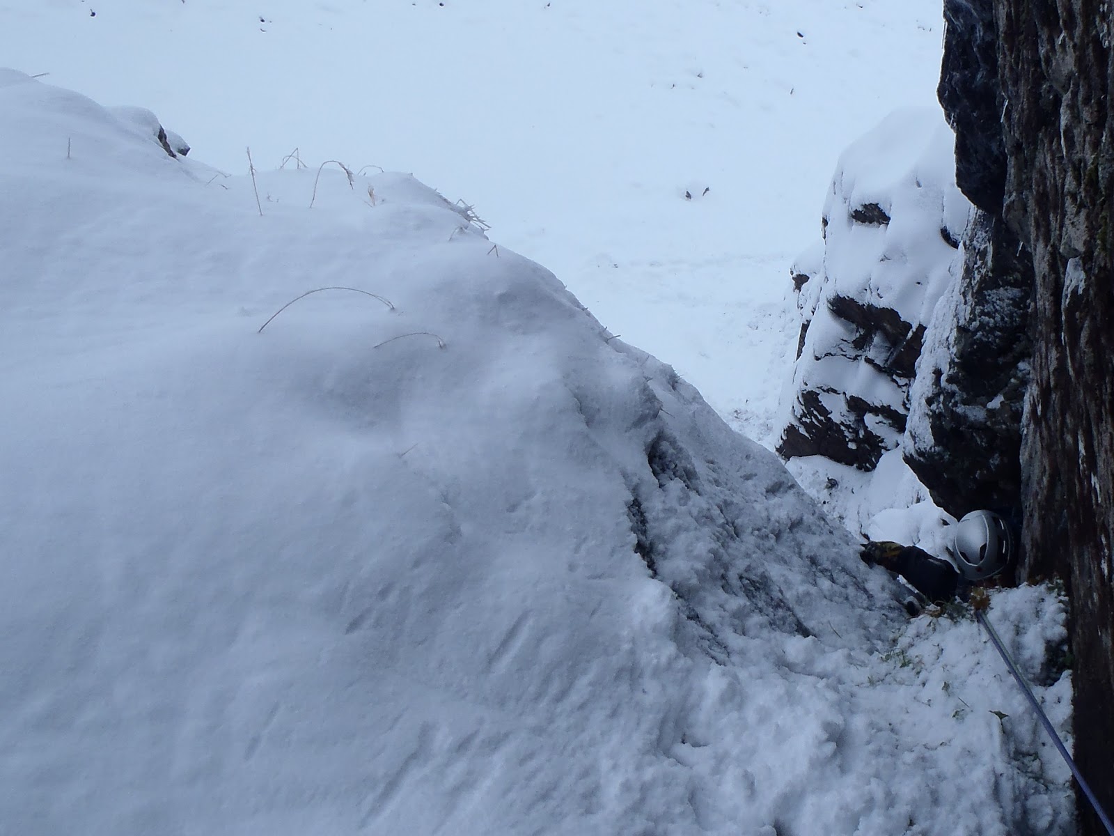 It was easy enough getting to the chockstone, but after this was the steep groove, which felt like climbing a vertical scree slope, under snow. There were just enough solid hooks to get me up (there were 2).
