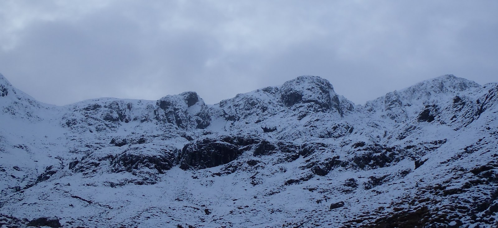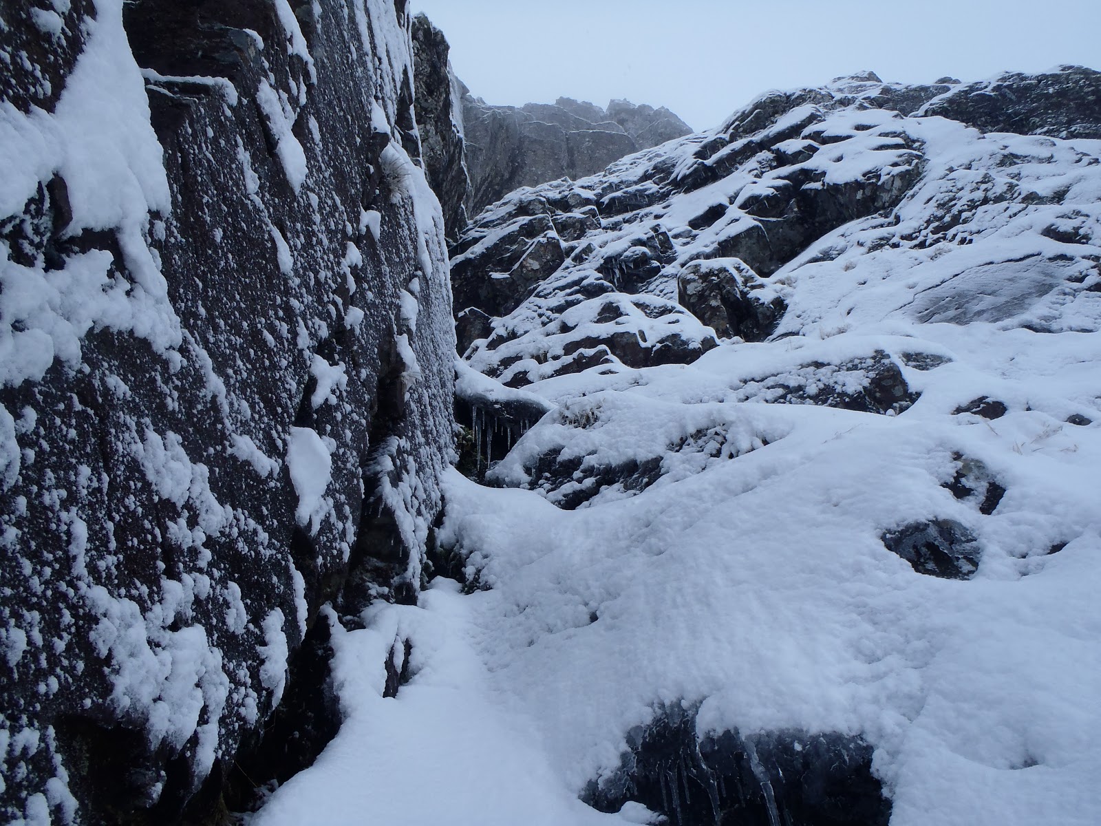 We walked easily up to the Lost Valley Minor Buttress Crag without any need for crampons. The snow is still unconsolidated, and hiding all the loose scree beneath. We haven't climbed on this crag before, and some of the routes looked good fun. The Chimney route looked good, but wouldn't have been a winter climb at all today - just bare black rock on the right side and in the chimney. Right Edge looked inviting - so I started up.