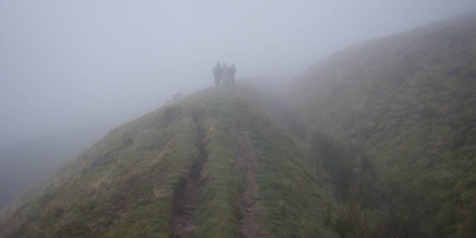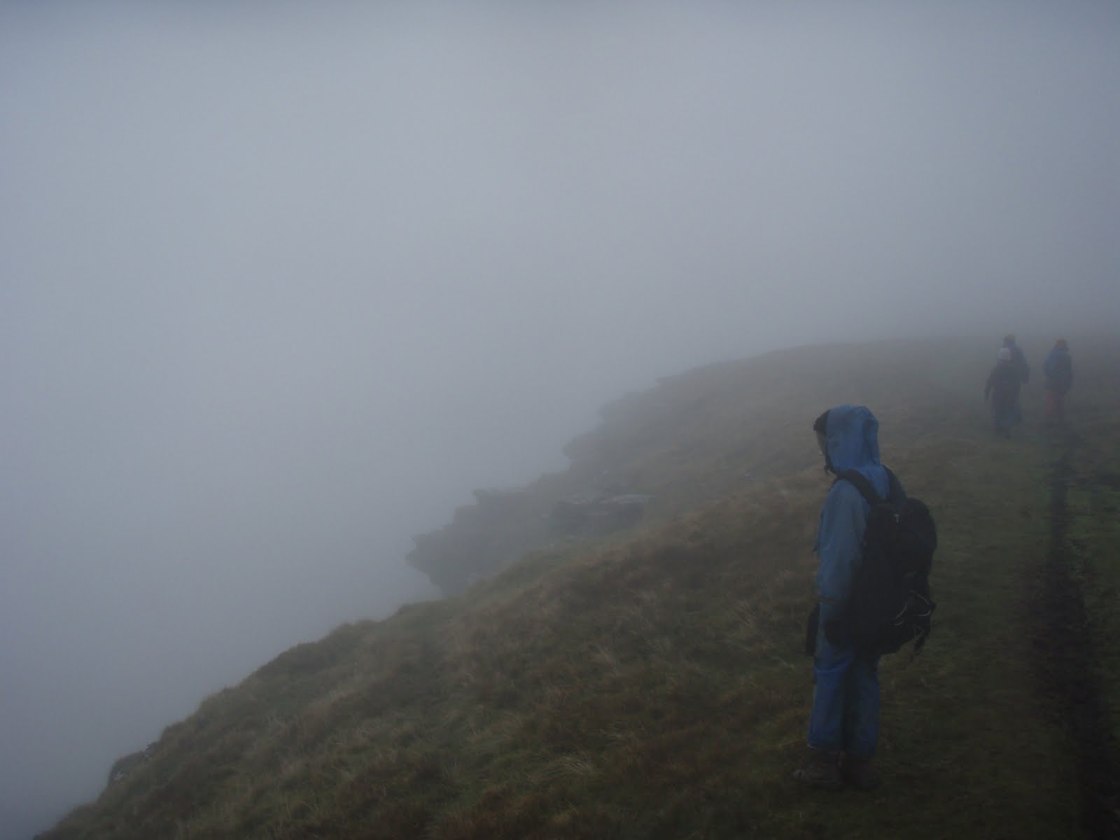 An exciting view in the hill mist over the drop down the side of the Black Mountains.