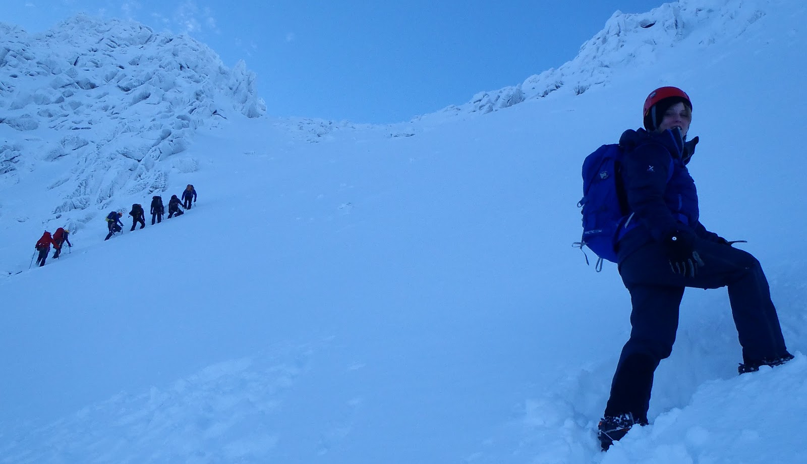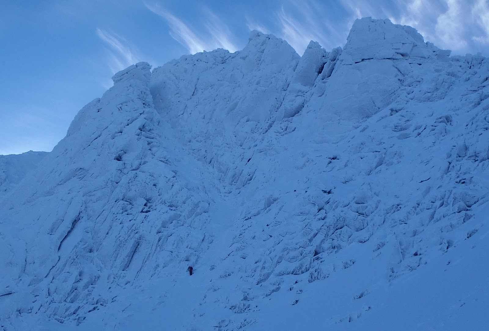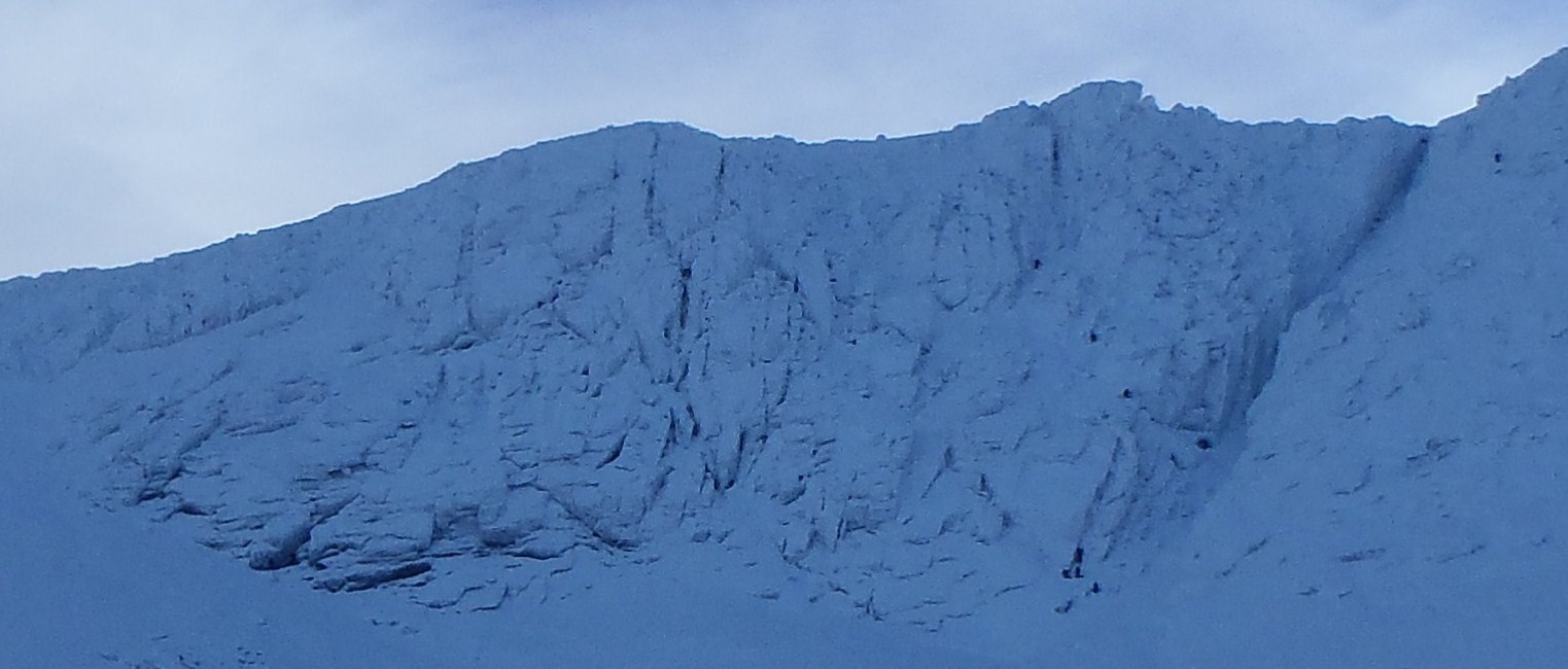 We made our way over to the Fiacaill Buttress, and with crampons, and careful route selection we made our way up to the notch to the right of the crag. There was some 'interesting' snow on the way, and Kevin's team in particular was being cautious of slope convexities, where they had found easy deep shears lower down.