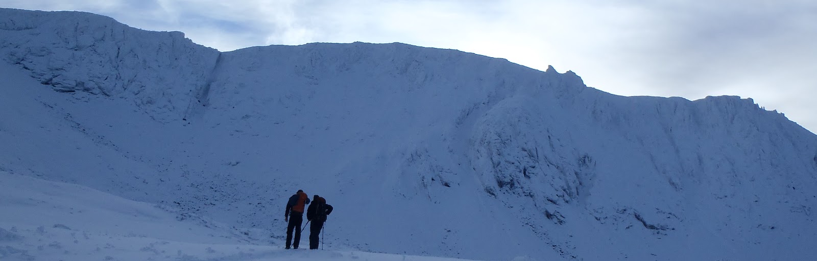 GL was day 2 of Winter Skills for the Berghaus team to test their gear. The weather was very different. The cloud level had risen, mostly to above the summits. The wind had dropped even further, and there was due to be be low temps and no additional snow - fantastic. Unfortunatley due to the nature of the deep soft snow we had not found anywhere for ice axe arresting on Wednesday, and the often reliable flat ice of Sneachda and the Lochain path were buried, so no icy crampon work.