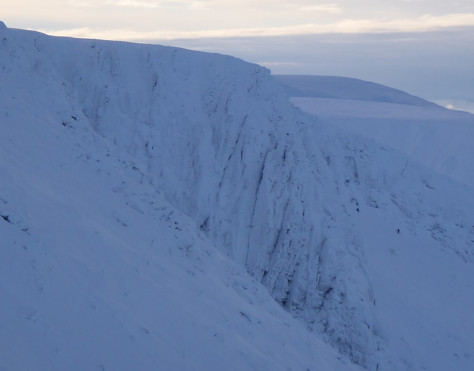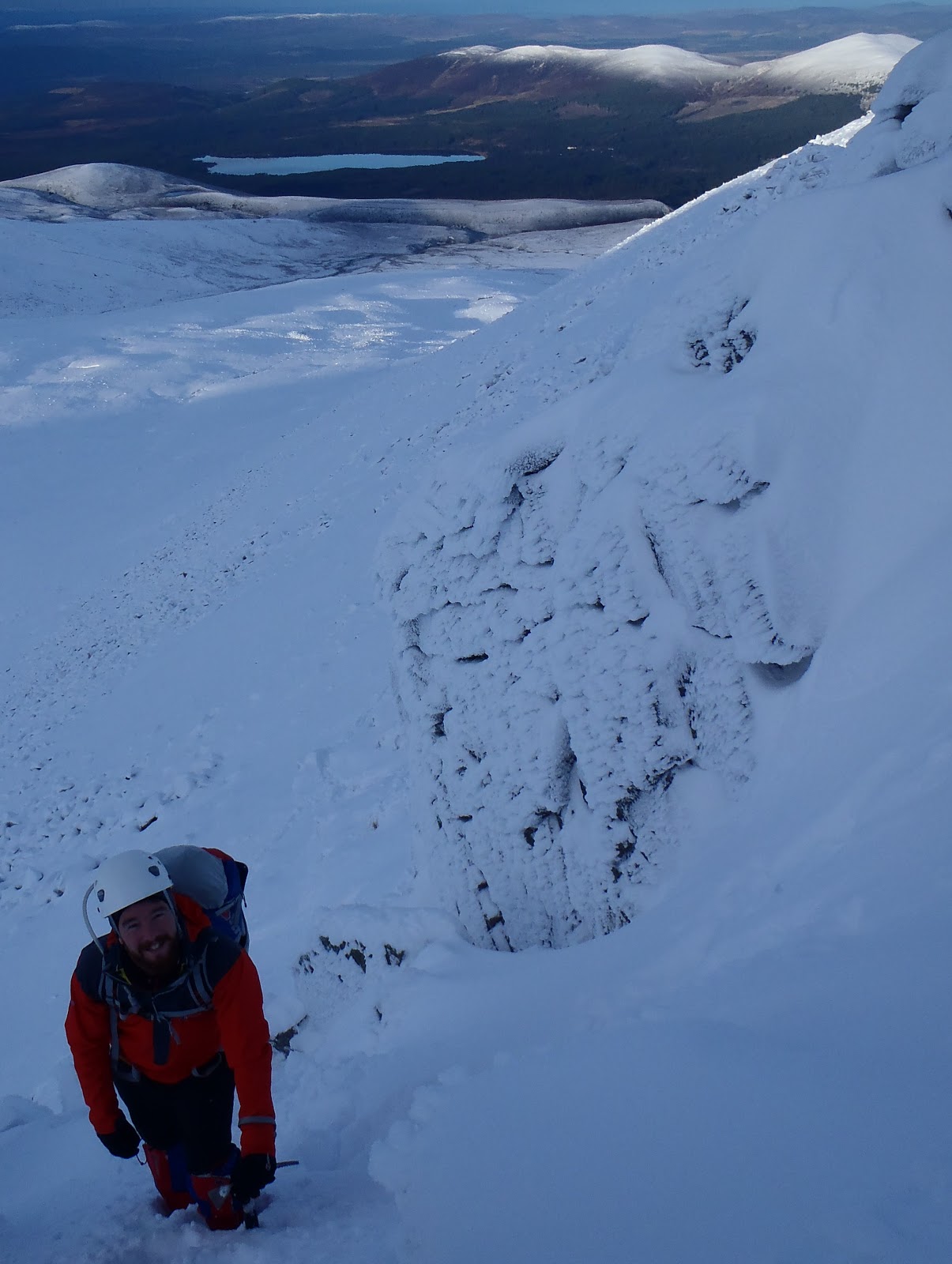 We made our way over to Stob Coire an t-Sneachda and met lots of climbers topping out from the Mess of Pottage in particular. The climbers were reporting a lot of rime ice on the rock, which could generally be cleared easily, often revealing a clear dry crack beneath. The snow was crusty/cruddy, unconsilidated and covered well frozen turf.