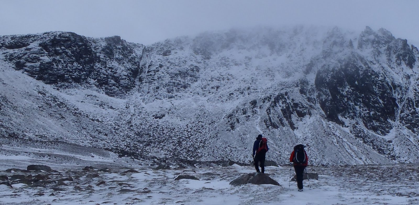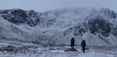 Walking in to Coire an t-Sneachda with Matt and LenaWe didn't know what to climb as a 3, but knew we didn't want to be hanging around in a queue in the cold winds, so we wanted anything that was free.